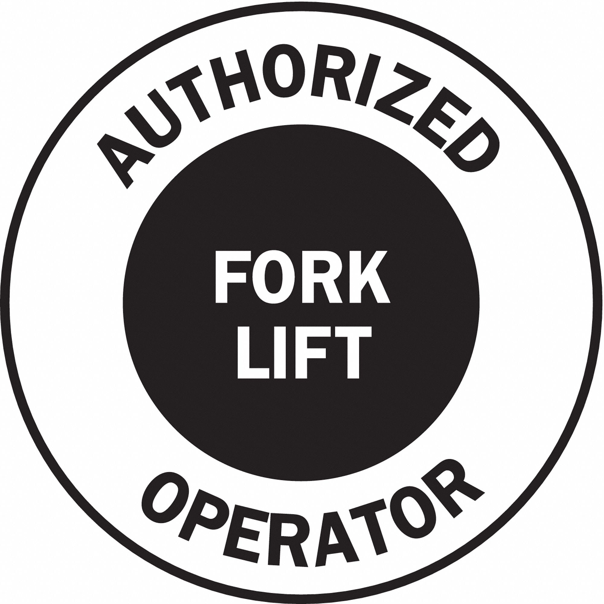 Hard Hat Label for Heavy Equipment Operators, Language English, Legend Authorized Operator/forklift, Header No Header, Material Vinyl, Height 2 in, Width 2 in, Legend Color Black, Background Color Black, White, Legend Style Symbol and Text, Shape Circle, Indoor/Outdoor Usage Indoor/Outdoor, Package Quantity 4