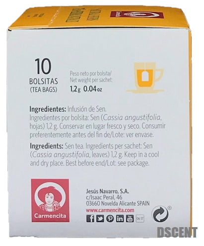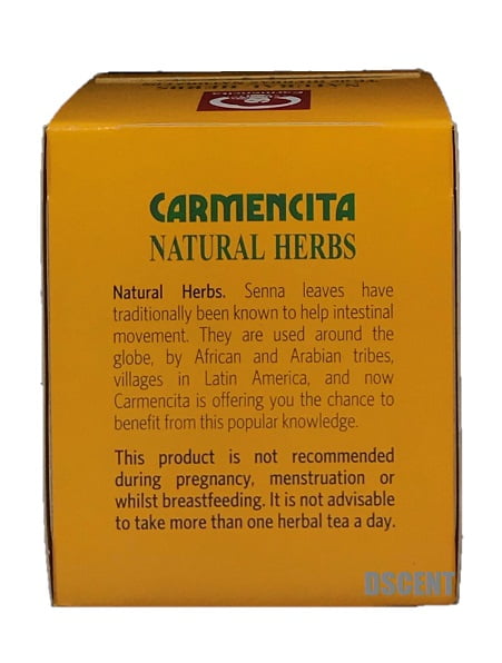 Natural Herbs. Senna leaves have traditionally been known to help intestinal movement. They are used around the globe, by African and Arabian tribes, villages in Latin America, and now Carmencita is offering you the chance to benefit from this popular knowledge.Carmencita Sen Tea Natural Herbs-Te Hierbas Naturales 10 Bolstas-Tea Bags 6 Pack