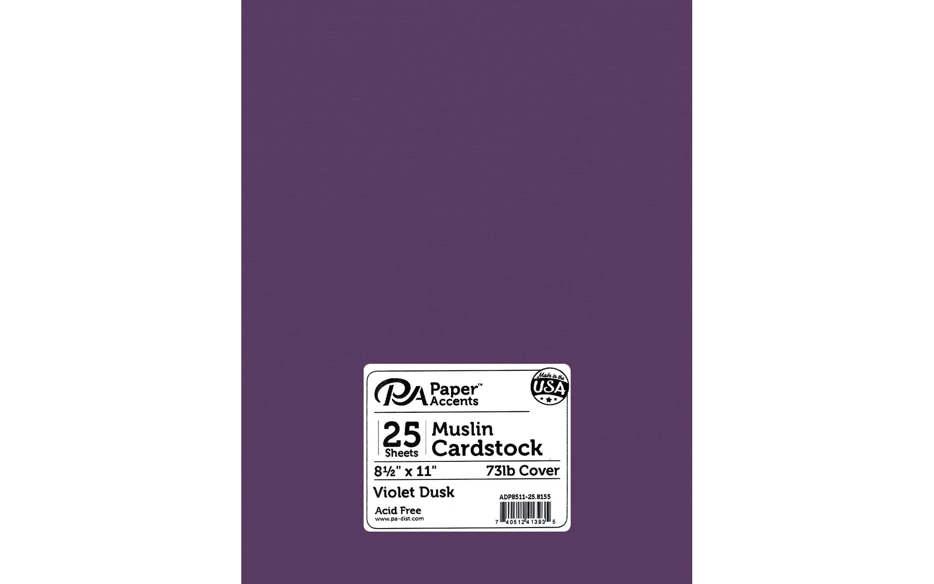 Paper Accents Cardstock is an acid free, lignin free, buffered, archival quality heavy cardstock. Great for scrapbooking, card making and rubber stamping. 8.5"x 11". Textured 73lb Violet Dusk 25pc- Fabric texture on one side.