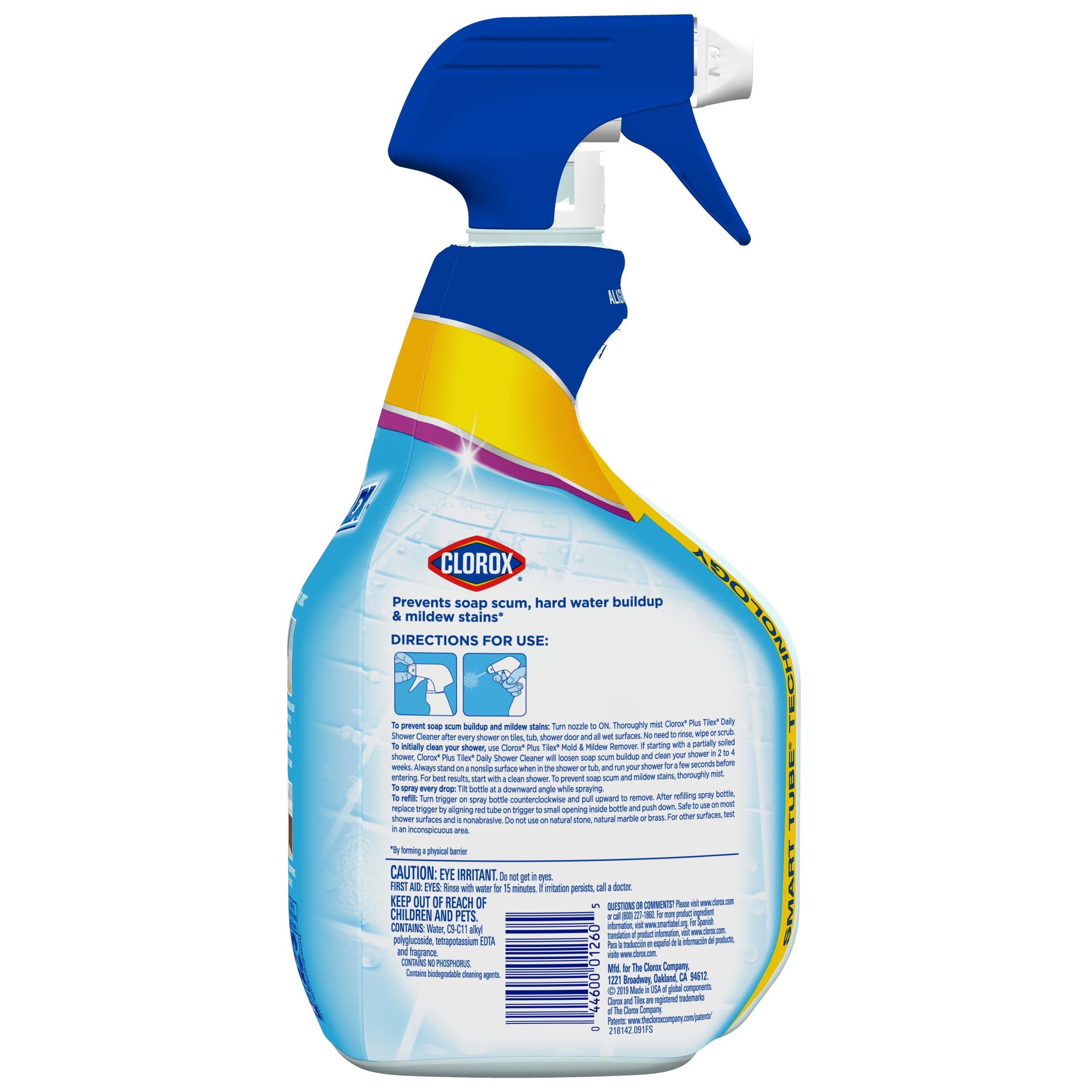 Clorox Plus Tilex Daily Shower Cleaner Spray helps make it easy to step into a clean shower every day. This Daily Shower Cleaner has a no rinse, no wipe, and no scrub formula, just spray and walk away. The bleach-free shower cleaner spray forms a protective barrier that prevents soap scum, hard water deposits, and mildew stains while leaving behind a fresh scent. The gentle formula contains no bleach, ammonia, or harsh chemicals, and it won’t scratch surfaces or leave behind a dull residue. Store the spray cleaner in a shower caddy or on a bathtub ledge and mist your shower after each use to maintain a radiant clean. Daily Shower Cleaner spray is safe to use on glazed and unglazed ceramic tile, grout, vinyl, fiberglass, and plastic. Use this no-scrubbing shower cleaner for tubs, shower doors, shower curtains, countertops, and sinks. Spray your way to a sparkling clean bathroom with Clorox Plus Tilex.