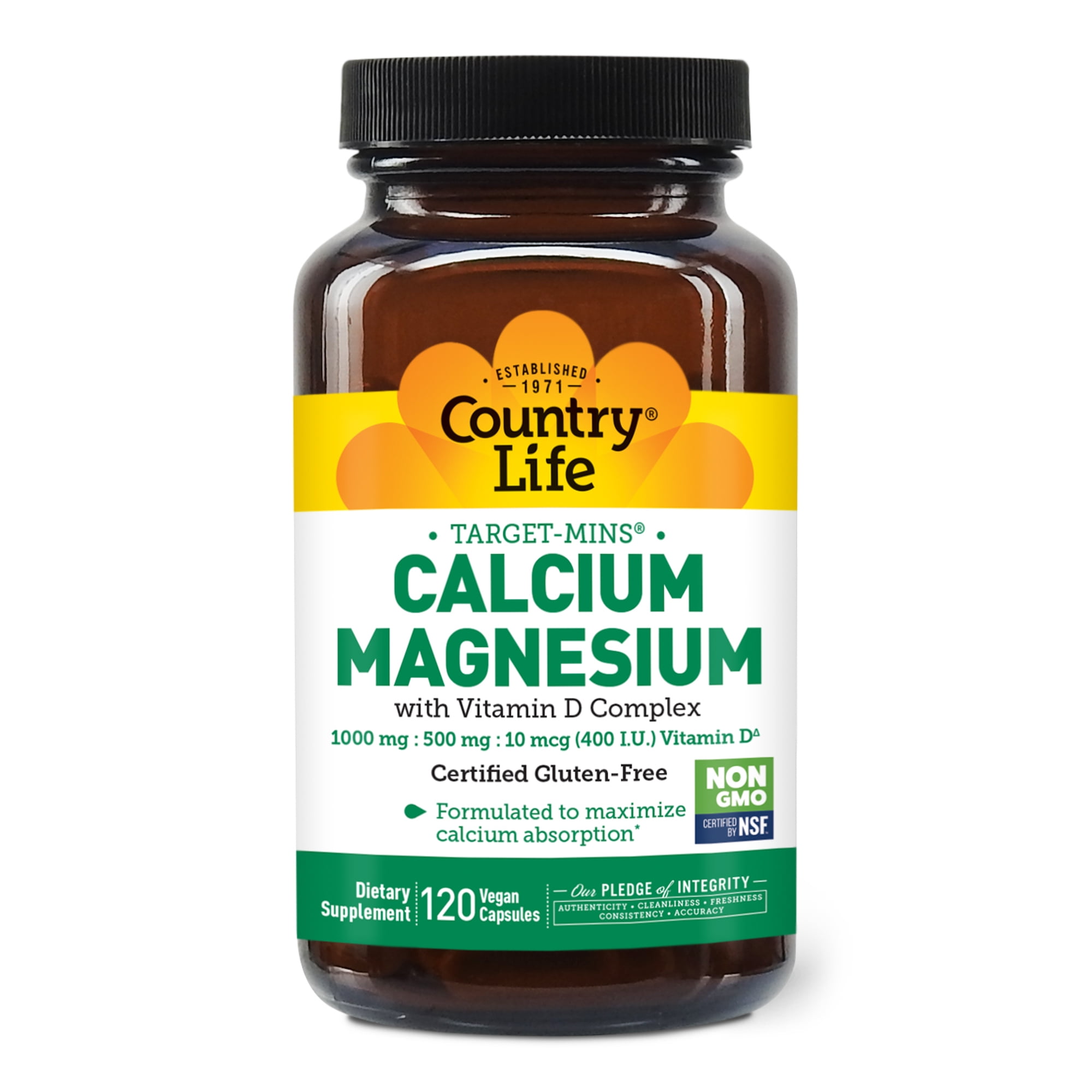 Country Life Target-Mins Calcium Magnesium with Vitamin D-Complex, 1000mg/500mg/10mcg, 120 Vegan Capsules, Certified Gluten Free, Certified Vegan, Verified Non-GMO Verified
