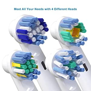 - 【MULTIPLE FUNCTIONS】This toothbrush heads set contains 4 different type of brush heads for different oral condition. Precision works for healthy teeth, Cross for deep cleaning, Floss helps tooth gap cleaning, removing stains of tea, coffee or cigarette.