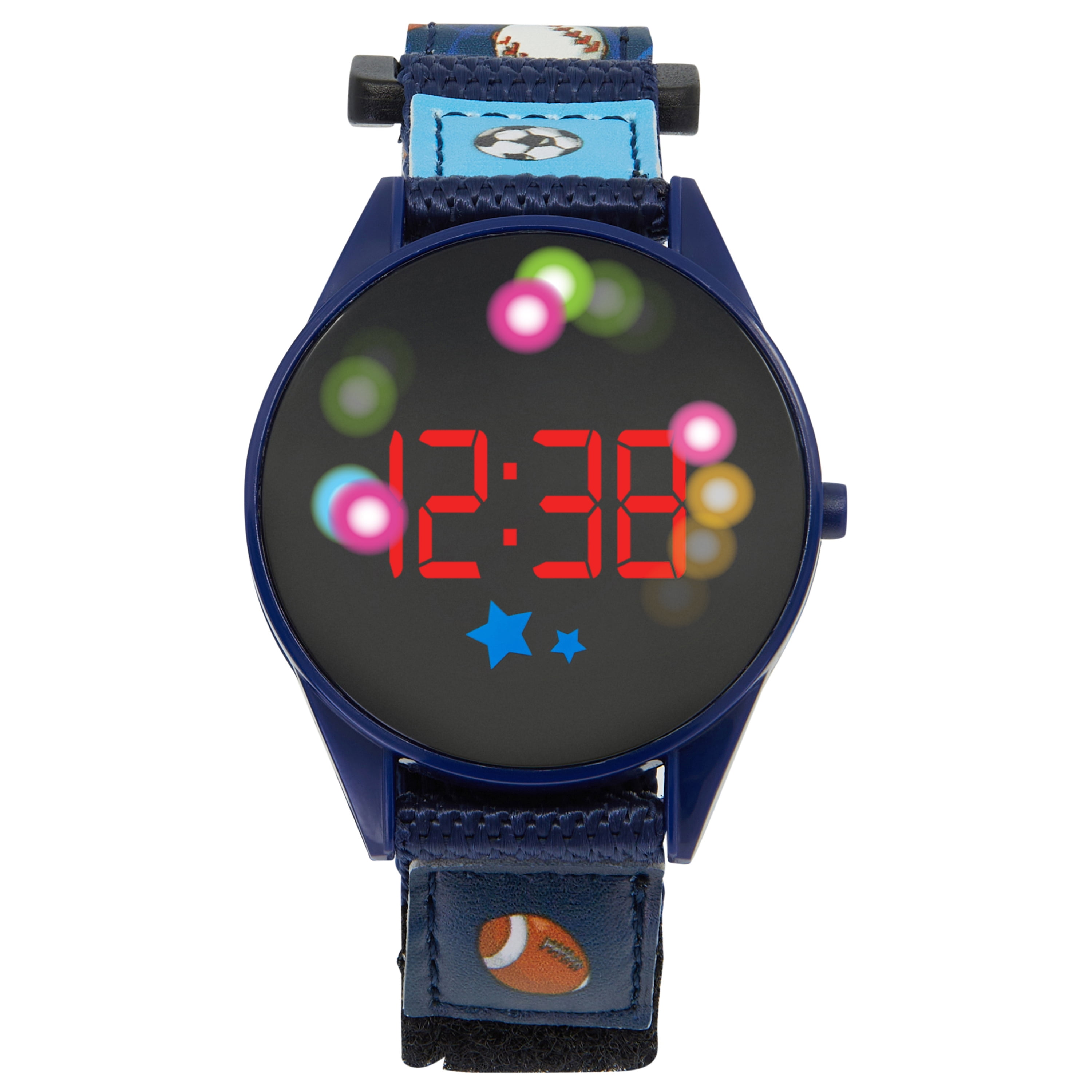 Marvel Emoji Kids’ Iron Man and Captain America Blue Plastic Time Teacher Watch, Blue Nylon Strap with Polka Dot Printing: