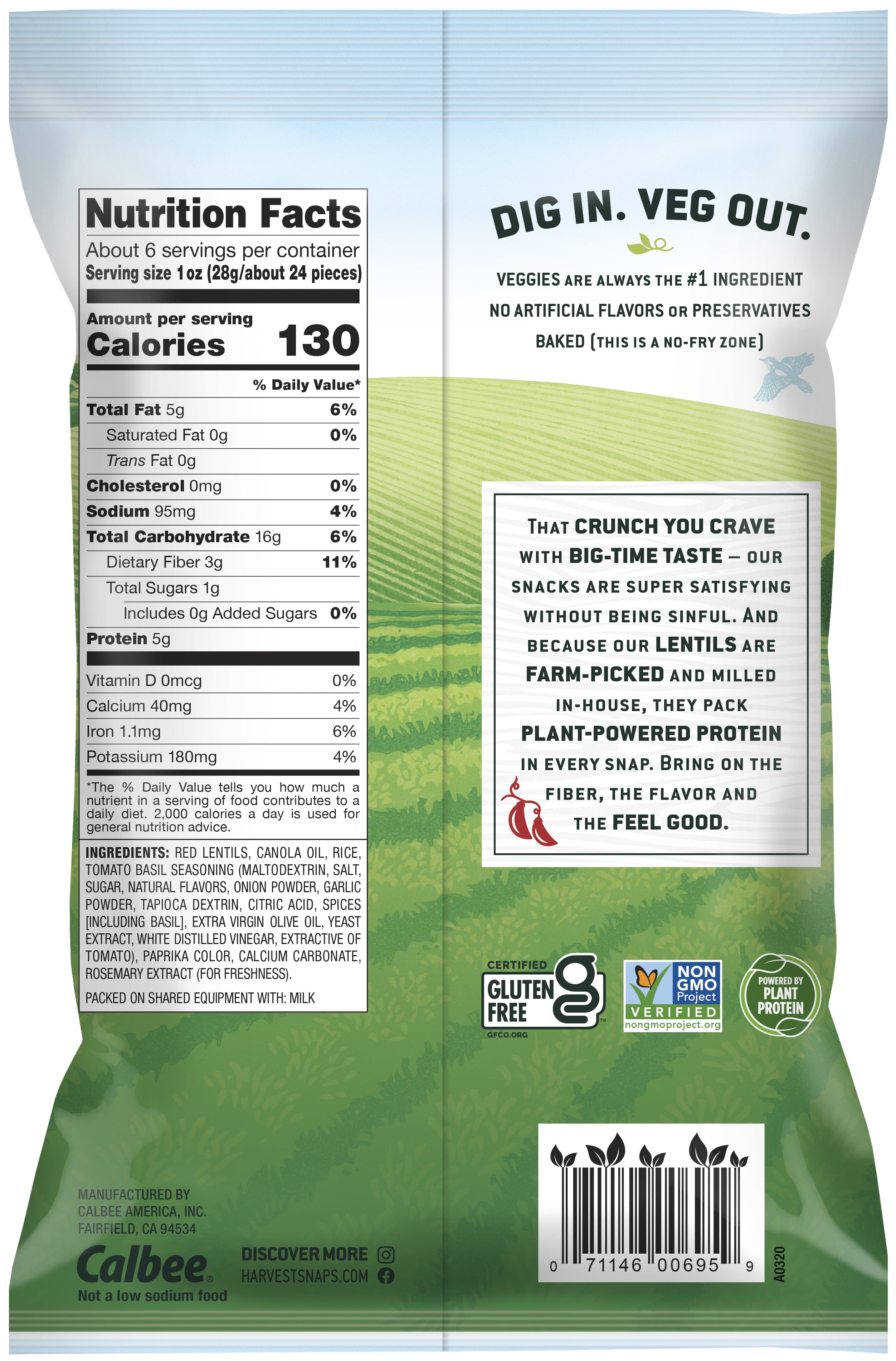 Our Harvest Snaps Gluten Free Tomato Basil Red Lentil Snack Chips, 5.85 oz are the real deal. They are made from farm-picked lentils that are milled in-house and then baked into pure snack perfection. The tomato basil flavor is the perfect combination of tangy and zesty. With nine deliciously crunchy and flavorful varieties, Harvest Snaps better-for-you veggie crisps empower you to enjoy snacking again without feeling guilty. They are certified gluten-free, vegetarian-friendly and naturally a source of plant protein and fiber.