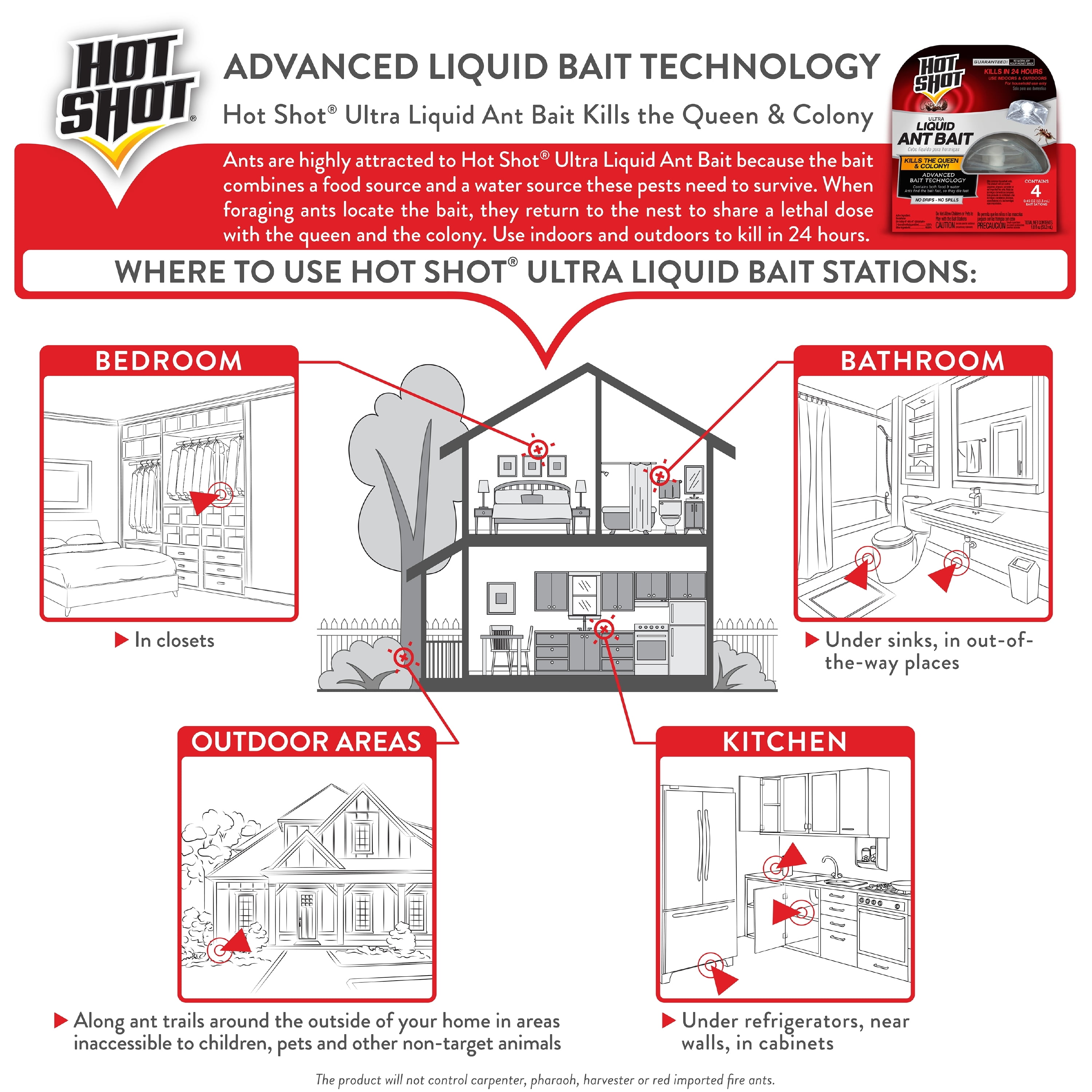 No matter where your pest problem rears its ugly head, Hot Shot insecticides are the answer to what’s bugging you. Hot Shot insecticides offer a complete lineup of indoor and outdoor solutions to keep unwanted pests out of your home, and out of your life. Ants enter the home in search of water and are most often found near water sources (i.e. kitchen and bathroom). This is because an ant can live for a long time without food, but cannot survive even one day without water. Hot Shot Ultra Liquid Ant Bait is extremely attractive to ants because it combines a food source with the water source they need, while delivering a lethal dose that can quickly eliminate the entire colony. This product is for residential use only and can be used indoors and outdoors. It kills common household ants in 24 hours. This product will not control carpenter, pharaoh, harvester or red imported fire ants.