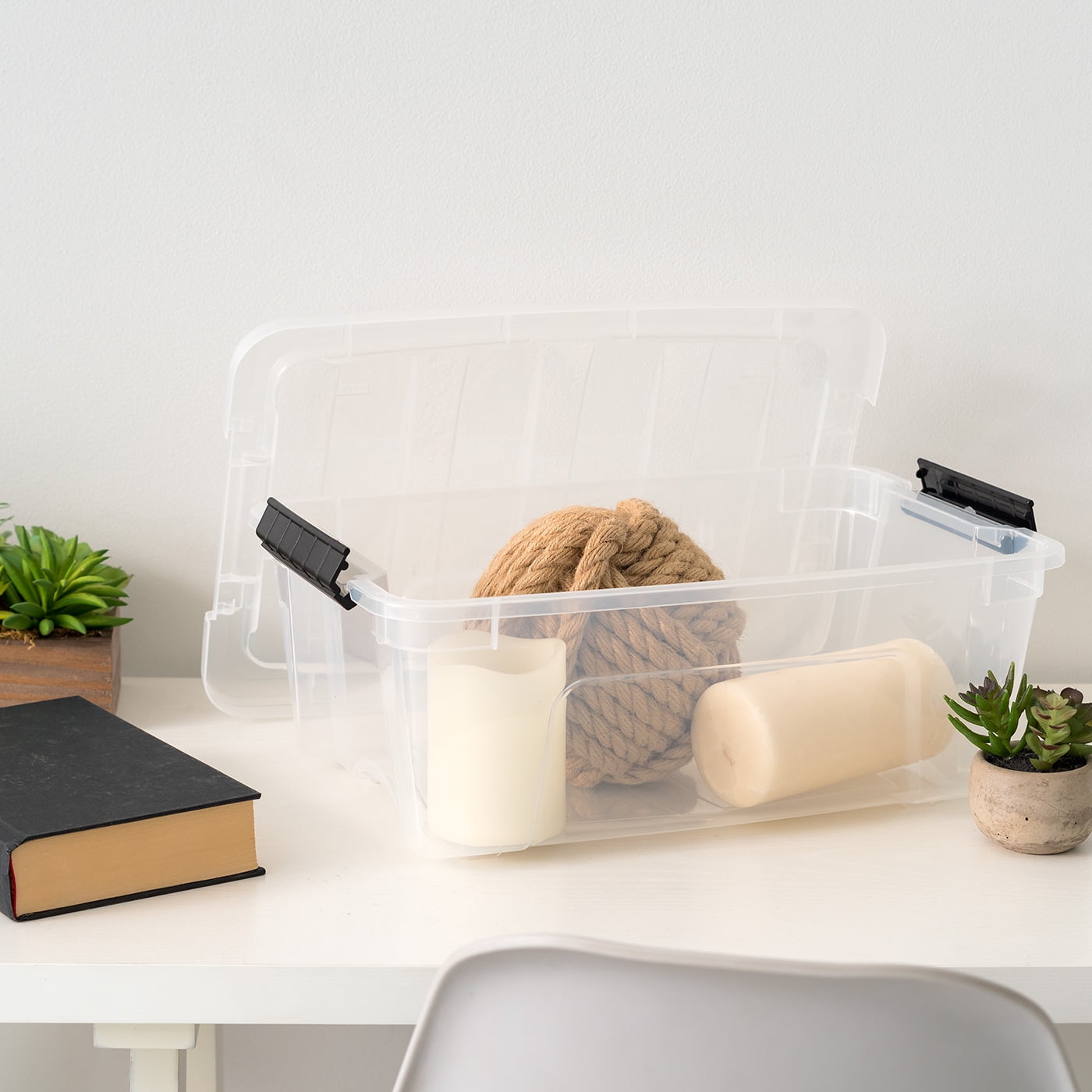 The modular storage system is built to meet your needs. This 12 QT Stack and Pull storage box easily stores shoes, craft supplies, office supplies, and more. Buckle-up latches keep the lid securely in place, and the built-in handle makes it easy to pull the box off of a shelf. Stacks neatly with other units in the Stack and Pull series.