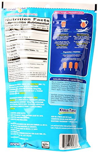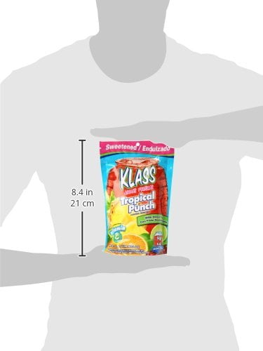 Drink Mix, Tropical Punch, Pouch 14.1 OZ Makes 9 qt (8.6 lt). With dried fruit. Good source of: vitamin C. www.klassco.com. Phone: 1-877-77Klass. Available Flavors: Rice & cinnamon, hibiscus, tamarind, mango, watermelon, cantaloupe, pineapple, tangerine, guanabana, strawberry, orange, limeade, pina colada, passion fruit, guava, rice-cinnamon & strawberry, peach and apple. Made in Mexico. To Make 1 glass: Add 1 tablespoon of Klass Tropical Punch (0.39 oz/11 g) to a glass of cold water (0.25 qt/240 ml) and stir to dissolve. To Make 1 Quart: Add 4 tablespoons of Klass Fruit Punch (1.55 oz/44 g) to 1 quart of cold water (1 qt), stir to dissolve. Serve with ice or refrigerate. Keep in cool and dry place/image references the flavor of the drink/lot and best before date in lateral seal. Keep in cool and dry place/image reference the flavor of the drink/lot and best before date in lateral seal. May Contain: milk and/or wheat and/or soy. Phenylketonurics: Contains phenylalanine. 14.1 oz (400 g) Houston, TX 77027 877-77KLASS