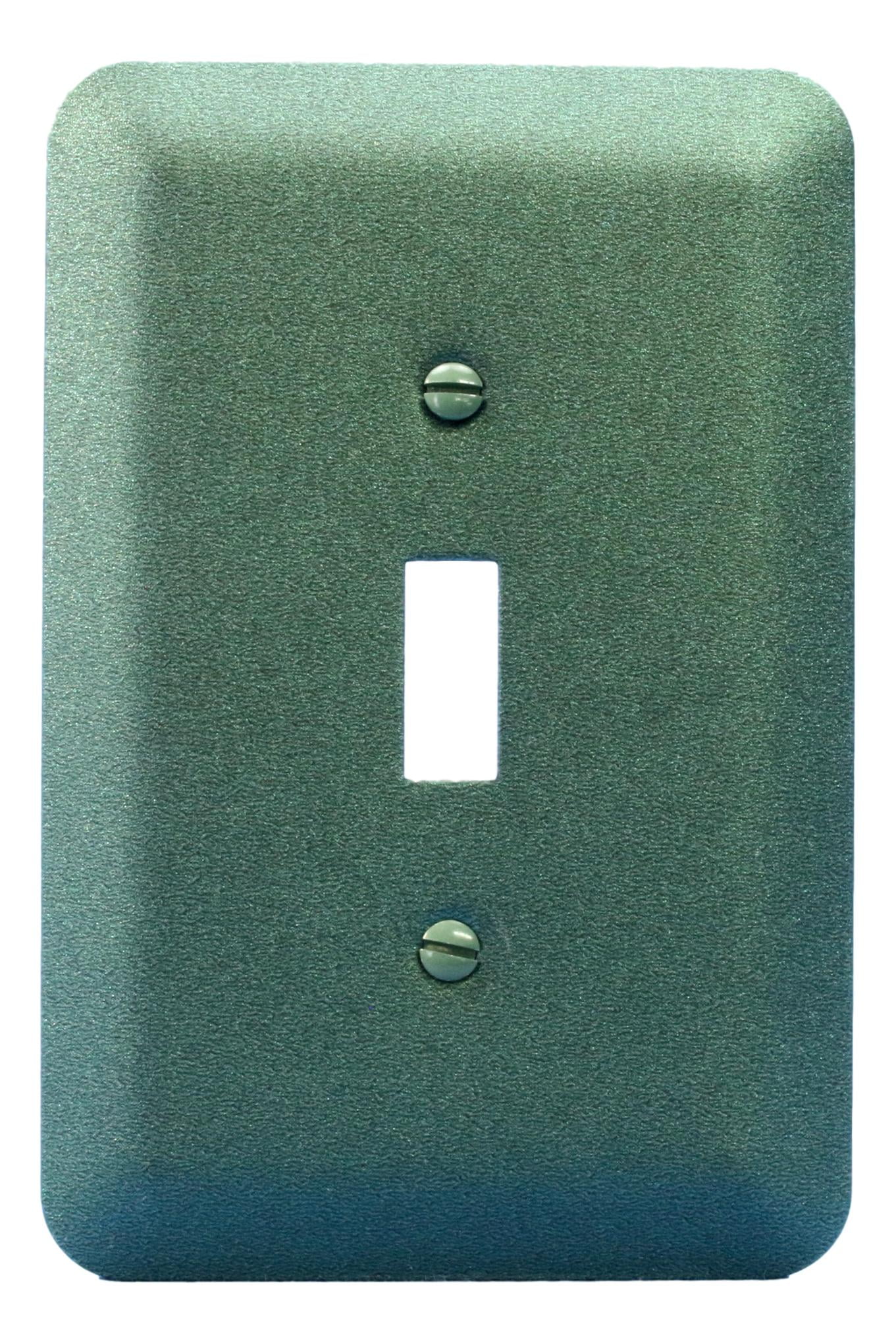 Leviton 89301-MGR metal switch cover with a metallic green finish. Residential Grade, single-gang wallplate with toggle switch opening. Oversized dimensions measure 5.25"h x 3.25"w, 3/4" higher and wider than conventional wallplates to provide maximum coverage of large box cutouts and wall irregularities