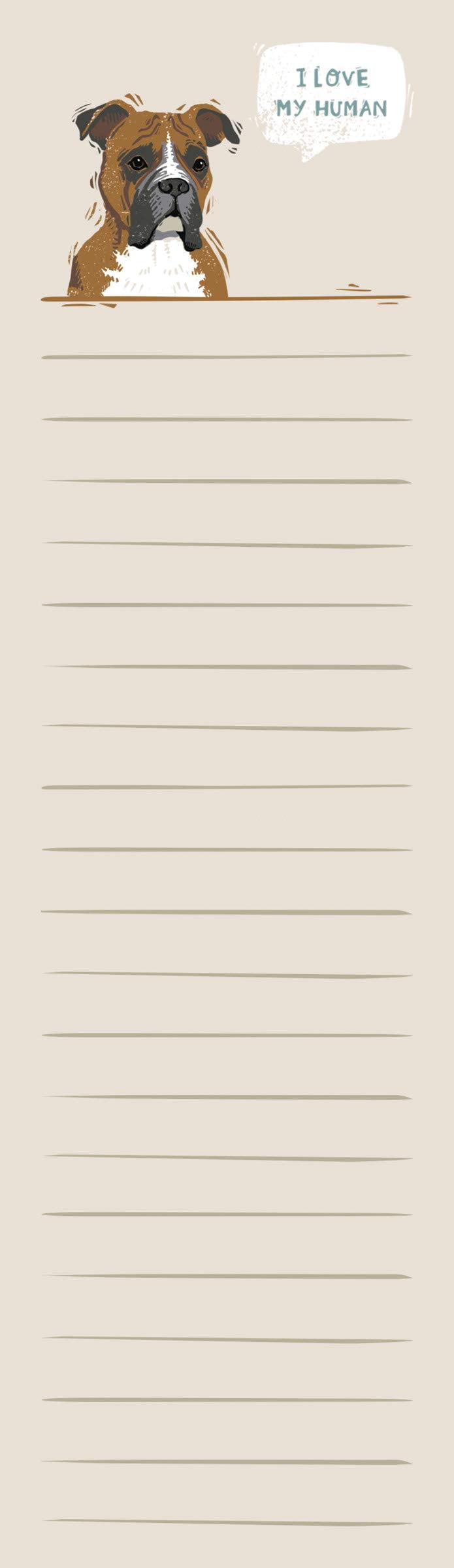 A list notepad lending a block print Boxer portrait design and "I Love MyHuman" sentiment. Includes 60 pages and strong magnet on back for easy hangingon refrigerator or other magnetic surface. Great for gifting! Made in USA.