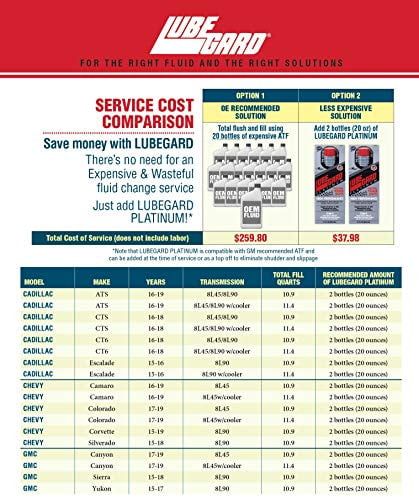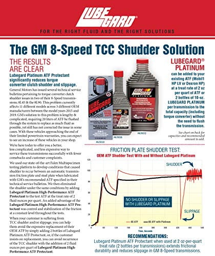 2 jobs → 1 solution – Use as a Conversion Additive to enhance base ATFs into OEM ATF equivalents. Simply add to any base ATF (except Ford Type F and CVT) to create a premium OEM ATF equivalent. This one product eliminates ATF confusion, requires minimal shelf space, and costs significantly less than OEM ATFs. Or, you can supplement your current ATF with Platinum to extend the life of the ATF and the transmission. LUBEGARD® High-Performance Automatic Transmission Fluid Protectant is a concentrated additive package infused with superior seal conditioners and friction modifiers. This unique product restores additive content to used ATF and enhances new ATF resulting in improved performance and smoother, more consistent shifting. It can safely be added to any automatic transmission fluid (ATF) including full High-Performance, semi High-Performance, conventional, and low viscosity fluids except Ford Type F or CVT. LUBEGARD® High-Performance Automatic Transmission Fluid Protectant is engineered to raise the thermal and oxidative stability level of automatic transmission fluids, so when it operates at elevated temperatures, it does not thin out and pyrolize, burn, or react with oxygen and form deposits. It is formulated with proprietary Liquid Wax Esters (LXE®) that are unique because of their natural lubricity, high viscosity index, and high flash and fire points. They can withstand repeated heating to temperatures as high as 570°F. LXE® gives automatic transmission fluid the extra lubricity needed for transmission’s unique frictional requirements. They improve heat conductivity, suppress foaming and, consequently, reduce transmission operating temperatures.Prevents overheating. Dramatically reduces friction & wear on metal parts and internal components. Will not alter the crucial sulfur balance in your transmission fluid. Will not harm yellow metals. Inhibits fluid oxidation and foaming. Contains patented Synergol® TMS Technology, a synthetic molecule that tightens the shift cycle without losing the friction modification at lockup, which eliminates shudder. Eliminates torque converter shudders. Ensures proper shifts. Frees stuck valves & keeps them free. Extends fluid change intervals. Protects & restores seals for optimum performance. Conditions & restores seals and o-rings. Does not contain any harmful components such as zinc (ZDDP)/ash, etc., like other competing products.