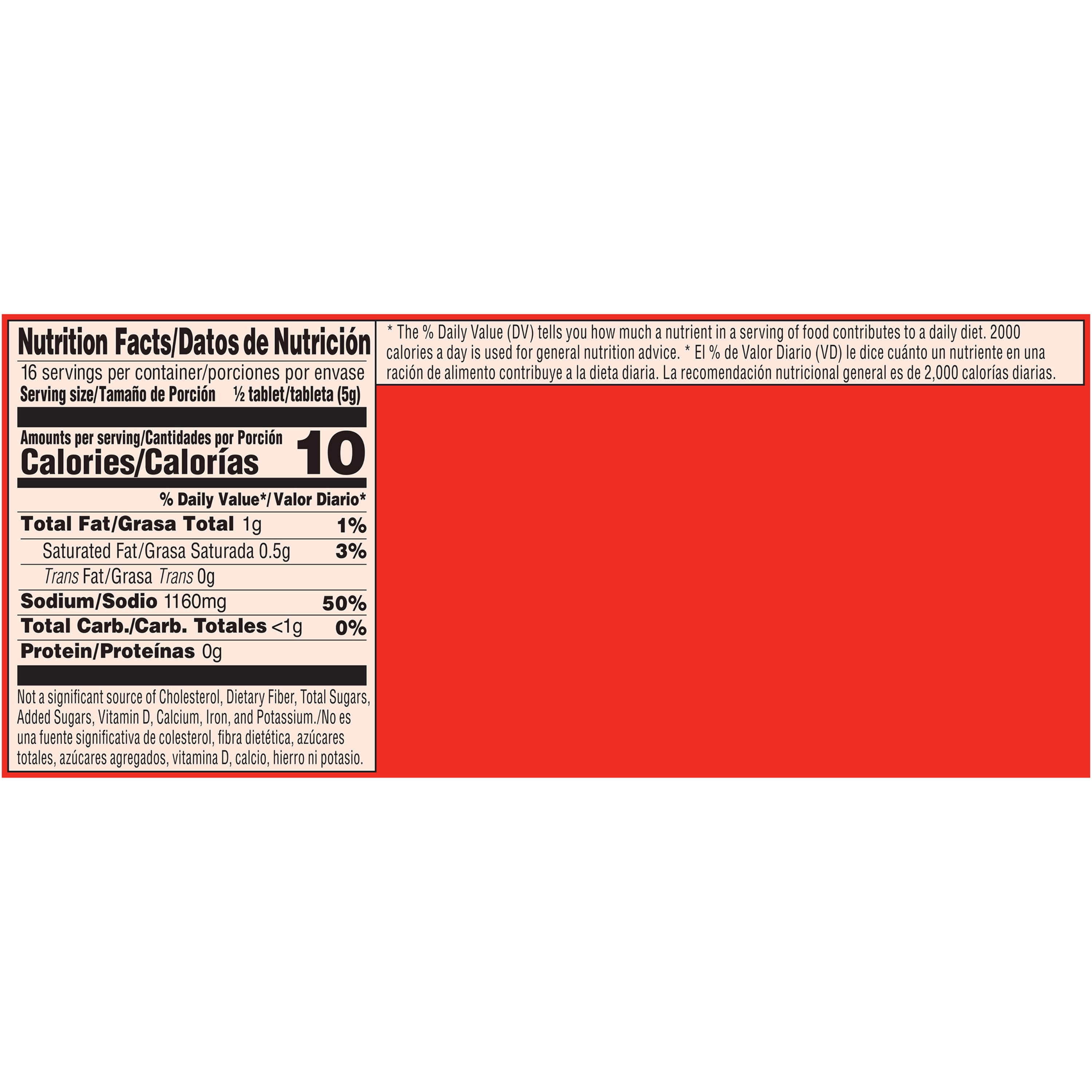 - Concentrate tablets contain 10 calories per serving (1/2 tablet/5 g). See nutrition information for sodium content