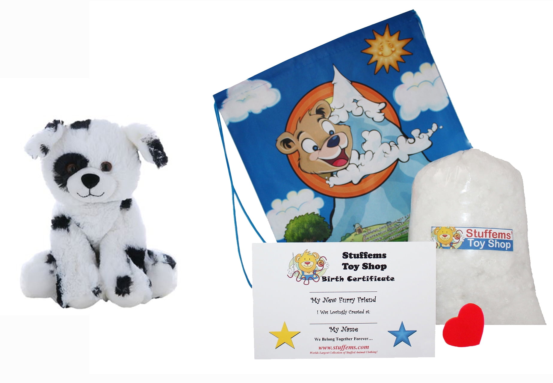 This un-stuffed Dalmatian plush kit comes with the 8" mini plush animal skin, necessary super-soft polyester fiber fill stuffing, a birth certificate, and a wishing heart insert (colors may vary). This kit comes with all you need to stuff your own 8 inch mini plush animal and make a wish that stays inside forever. Make your new friend a part of the family by creating a birth certificate. After making your new friend, dress him or her with an outfit from a huge collection of stuffed animal clothing (sold separately.) The easy seal closure seals your new friend without any need to sew or stitch. Our simple instructions make this project suitable for all ages. Perfect for Birthday parties, fund raisers and scout troop and school activities, gifts for grandchildren or make a wish animal for a military service member. All clothing and accessories sold separately.