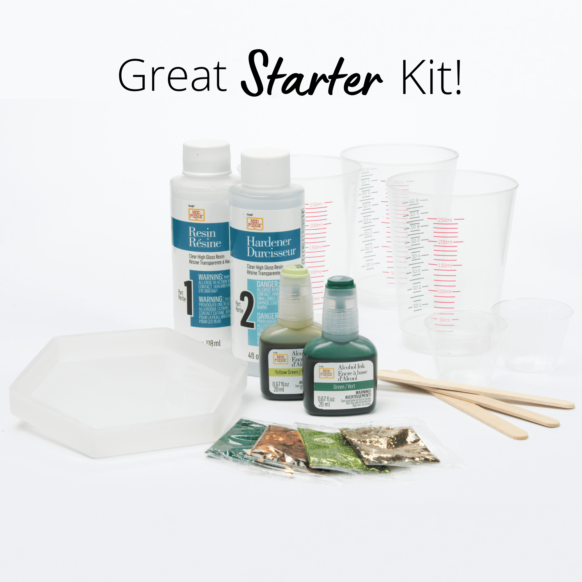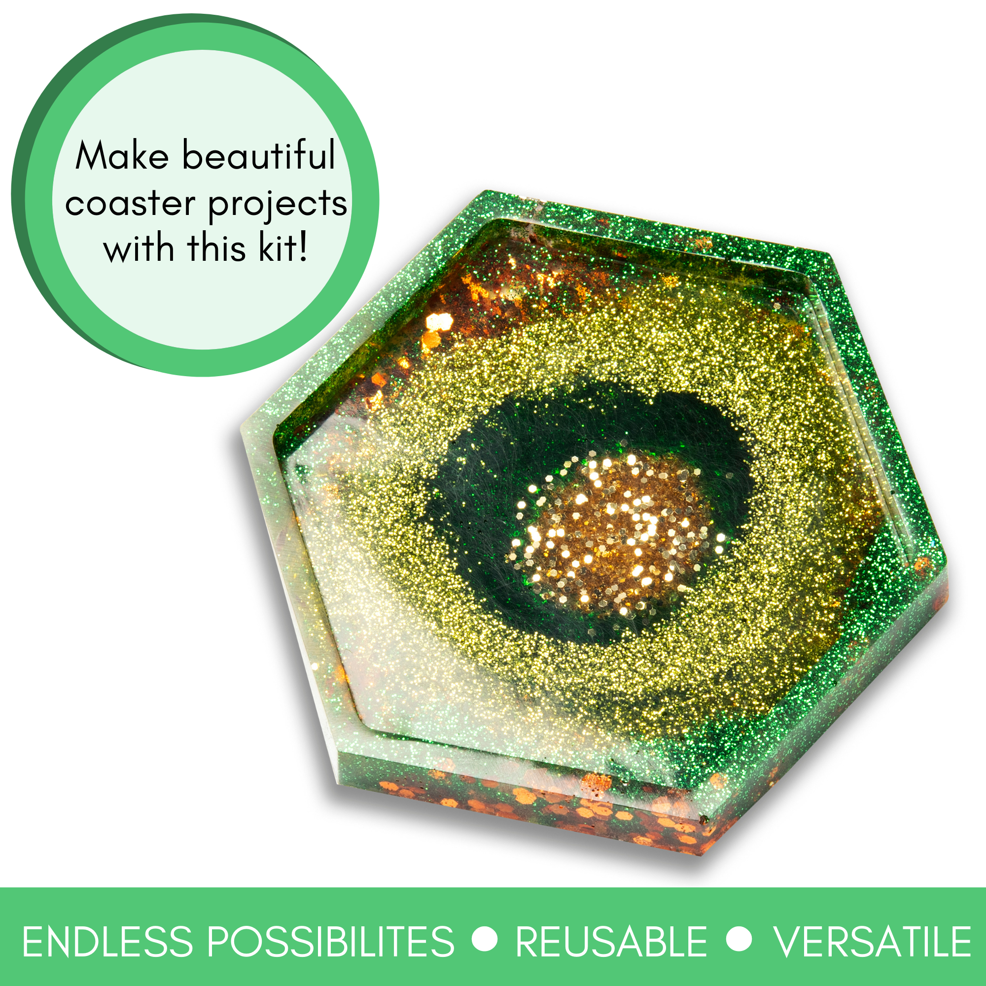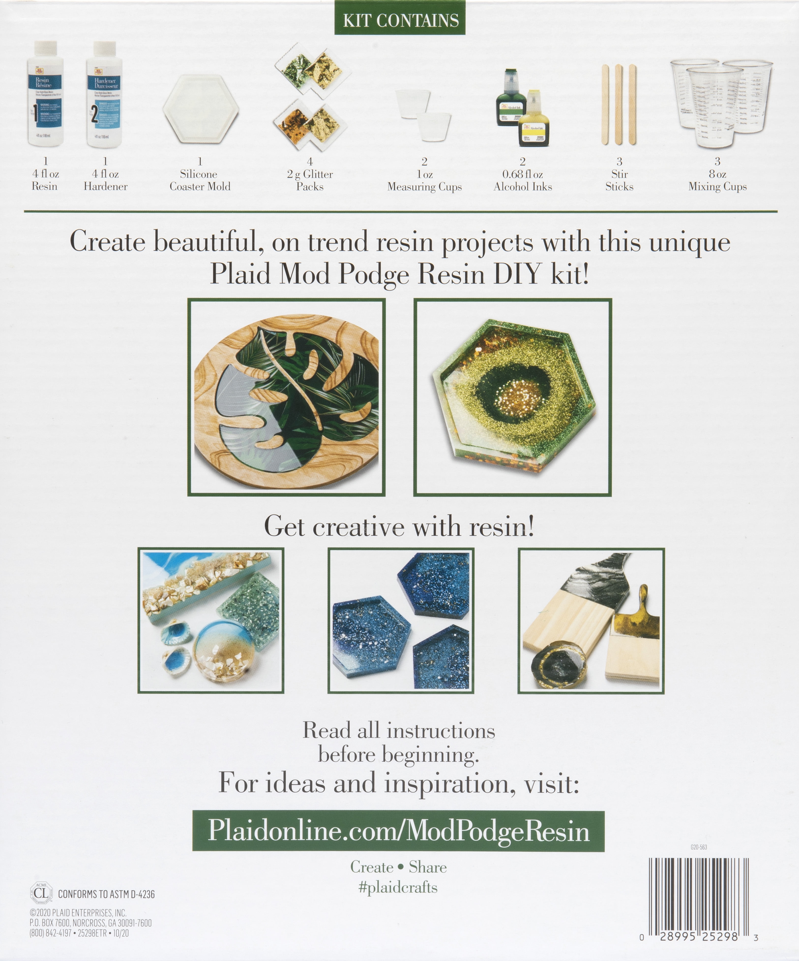 - VERSATILE COASTER KIT – This kit includes 4 oz resin, 4 oz hardener, 2 – 22ml alcohol inks, 4 – 2 gram glitter packs, 3 stir sticks, 2 – 1 oz measuring cups, 3 – 8 oz mixing cups, 1 silicone hexagon coaster mold, and instruction sheet. Mod Podge Tropical Leaf Plaque is sold separately