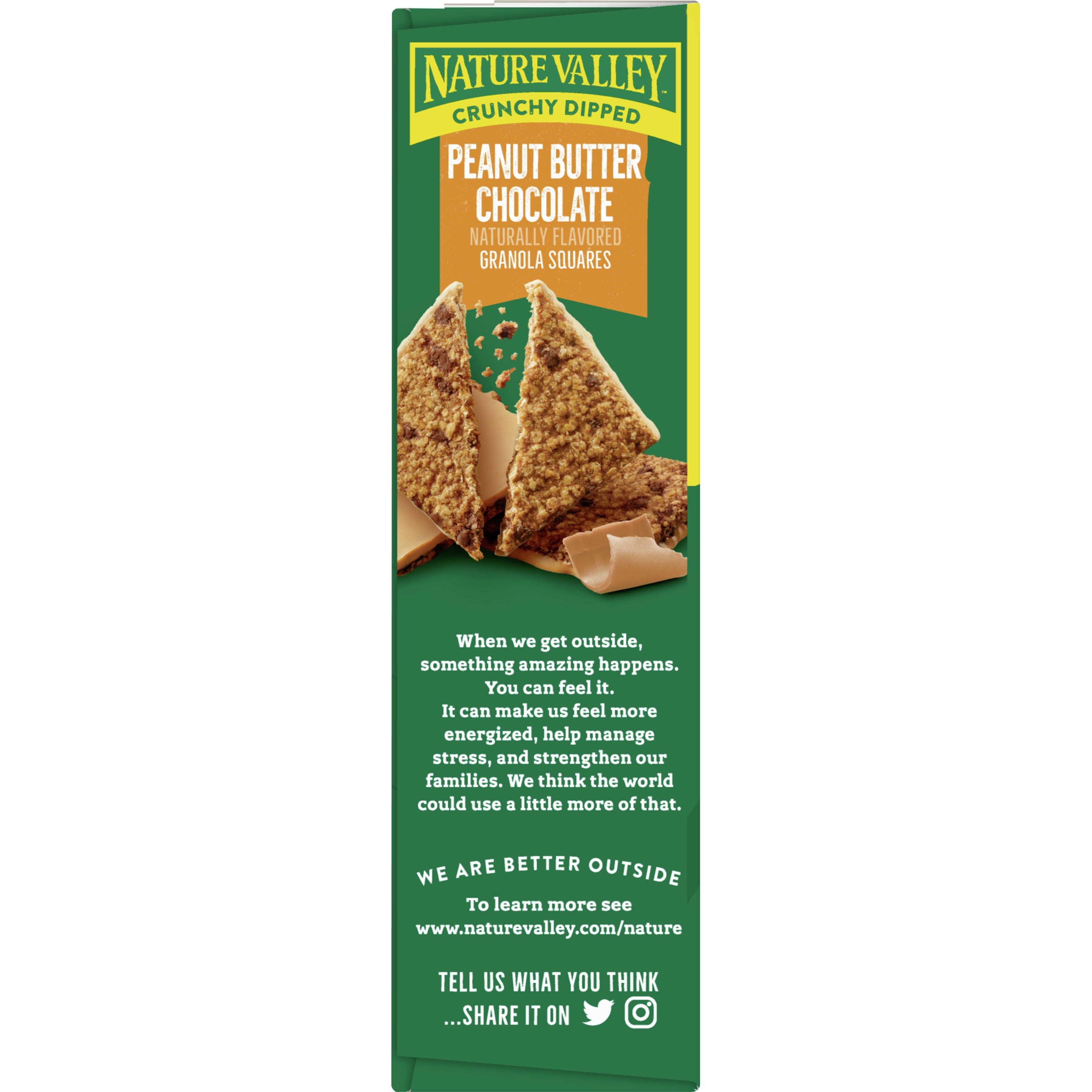 Crunchy and dipped in delicious. Nature Valley Crunchy Dipped Granola Bar Squares are the indulgent treat that deliver satisfying crunchy and creamy textures with delicious oats. Available in Chocolate, Peanut Butter Chocolate and Salted Caramel; this snack contains no artificial flavors, colors or high fructose corn syrup. At Nature Valley, we believe that what you put in is what you get out. So when you need to be great out there, you can rely on us for real goodness, wherever and whenever you need it.