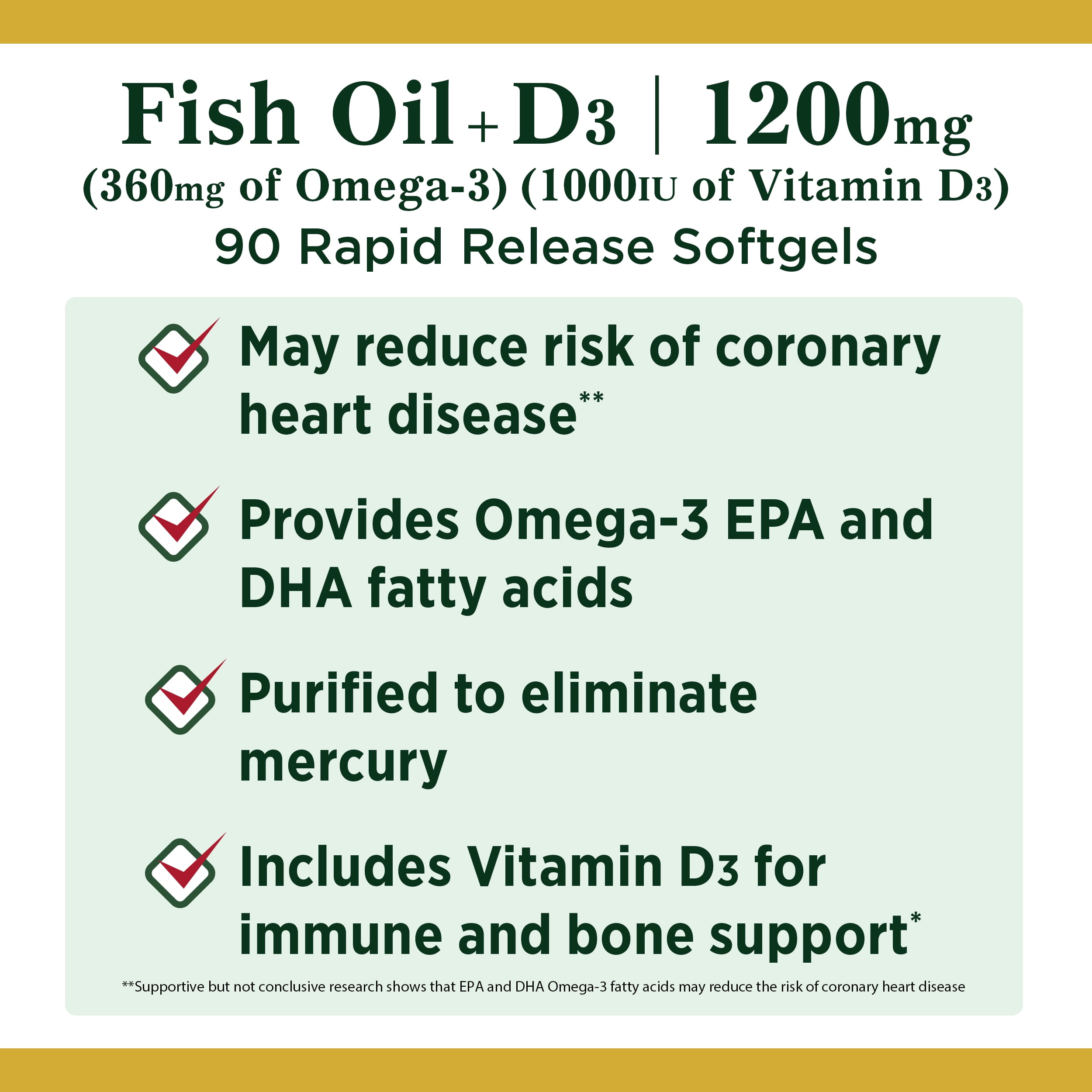 - Nature’s Bounty Fish Oil + Vitamin D Softgels, 1200 Mg, 90 Ct: