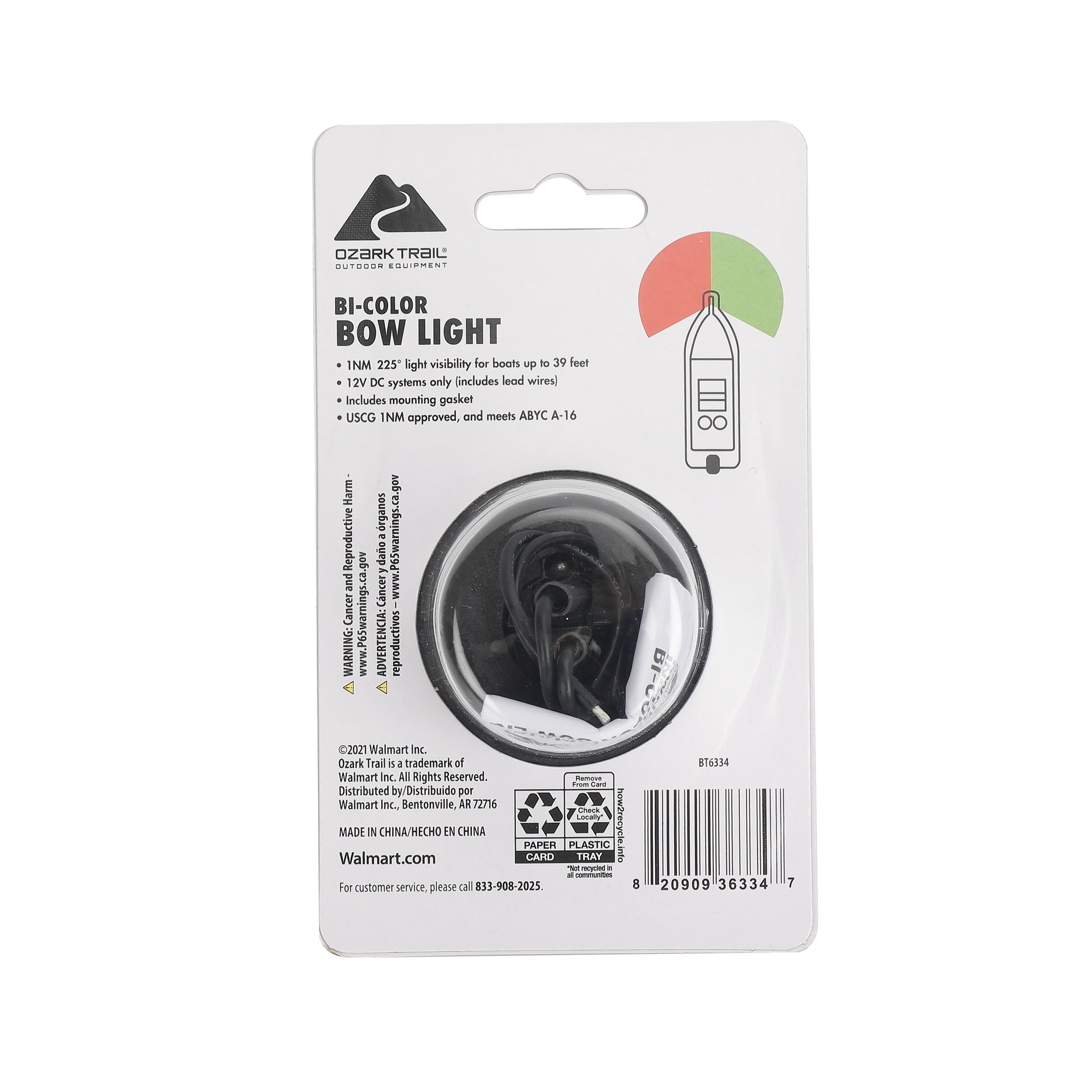 Keep your boat up on night-time boating requirements with the Ozark Trail Marine Red and Green LED Bi-Color Bow Light. Being seen by the Coast Gard and other boaters at night is important for your safety and it’s the law. This bi-color light features red and green maintenance-free LEDs that produce enough light for the visibility requirements and draw minimal power from your battery. So you can keep listening to your music on the stereo or your fish finder and be compliant with the law. The stainless steel housing keeps the light protected and corrosion-resistant from the elements.
