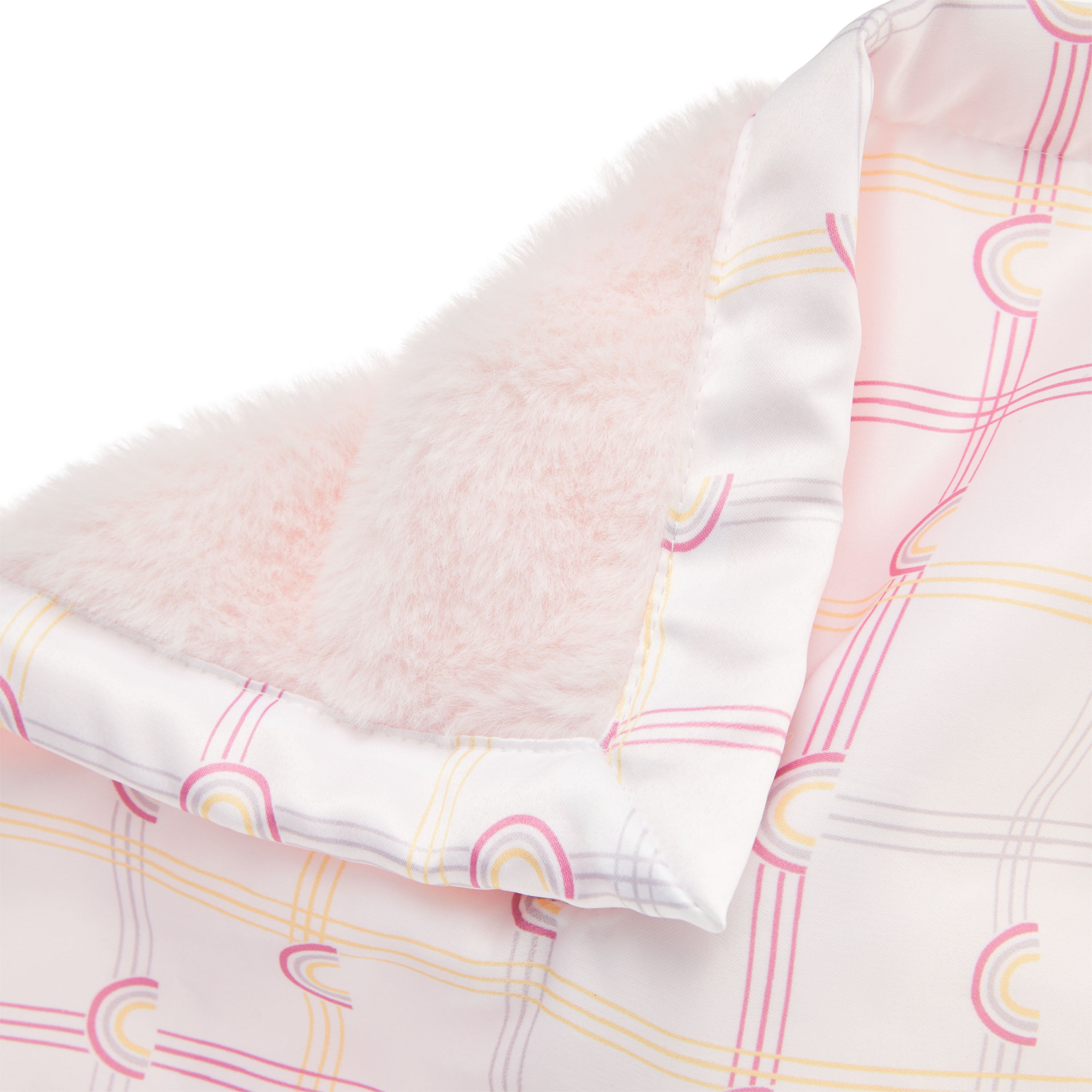 - Two sided security blanket has plush fabric front, reverses to printed satin back