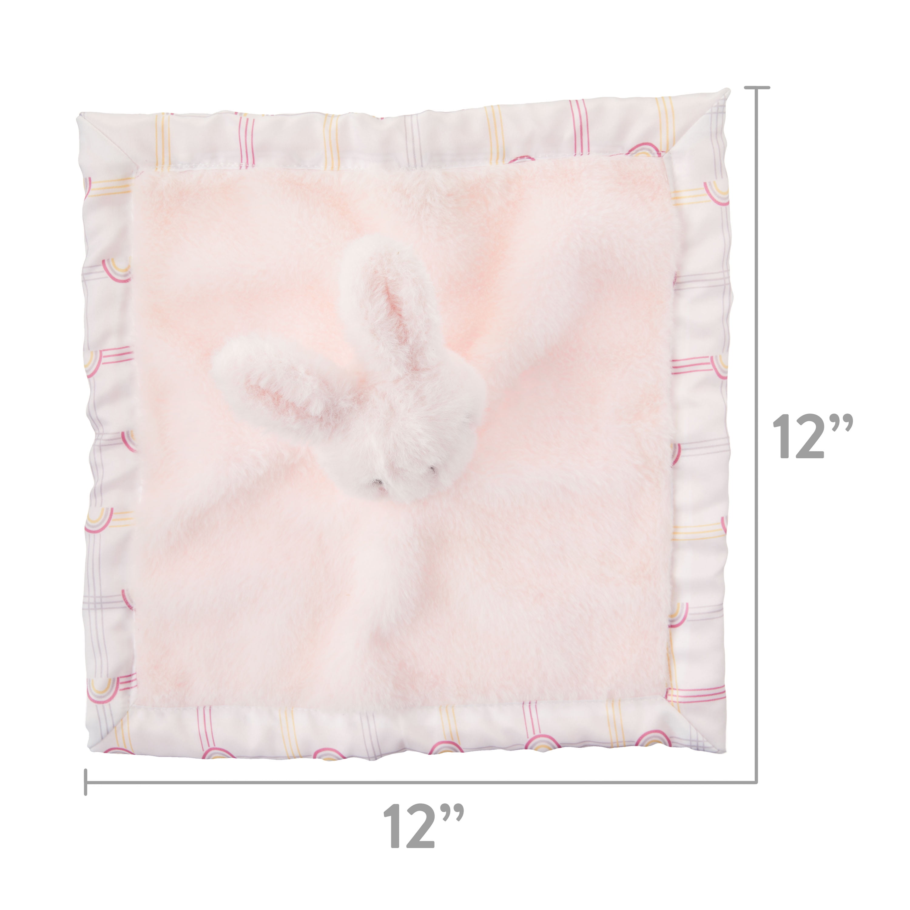 The super soft Parent’s Choice Bunny Security Blanket has a variety of fabric textures, making it perfect for baby to snuggle up with! Ideal for boys and girls alike, this blanket has a plush pink bunny character at the top and measures 12 inches by 12 inches. Soft and cuddly plush solid pink front that reverses to a silky smooth allover rainbow print satin back and finished with a leaf print satin edge. Perfect size to take on the go and throw in the diaper bag! Made from easy to care for super soft fabrics, this blanket is independently certified with STANDARD 100 by OEKO-TEX. Give your baby the ultra-cuddly Parent’s Choice Bunny Security Blanket.