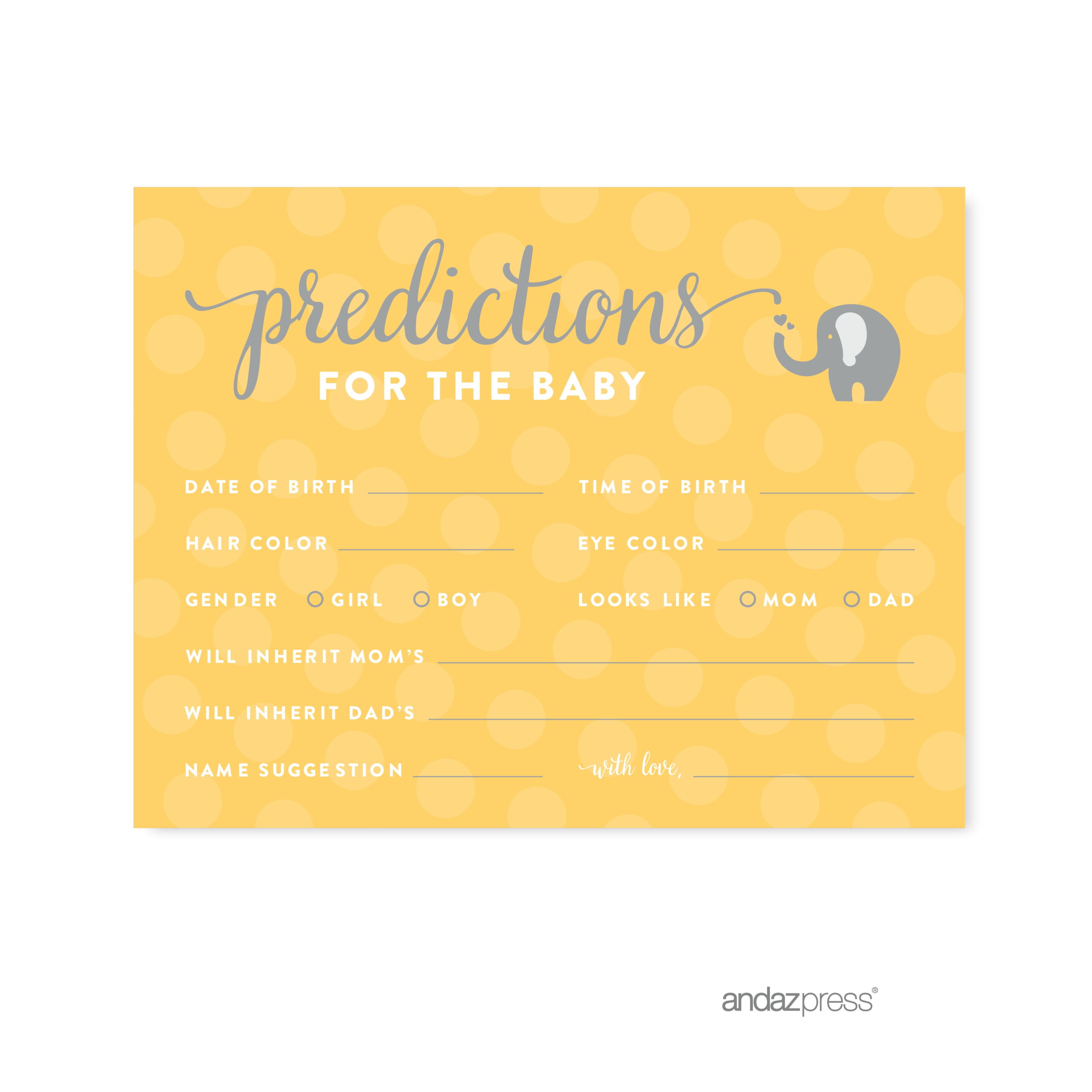 Predictions For Baby Yellow Gender Neutral Elephant Baby Shower Games, 20-Pack