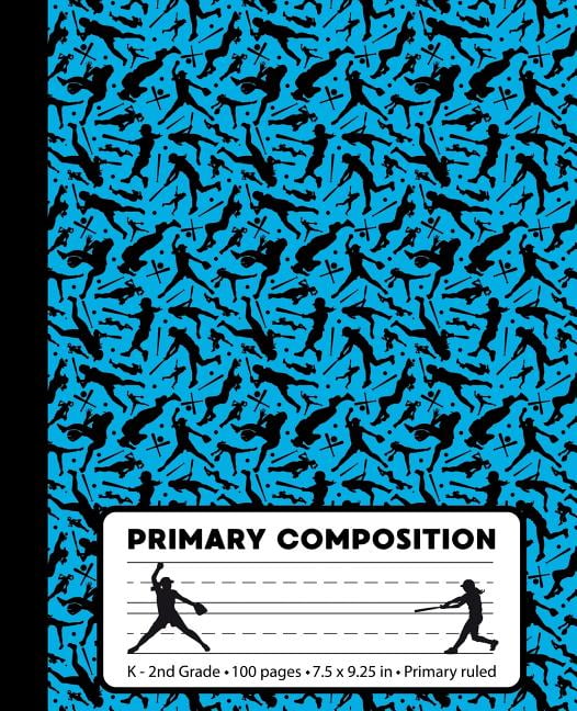 Primary Composition: Softball Player Blue Marble Composition Book for Girls K-2. Sports baseball notebook handwriting paper. Primary ruled – middle dotted guide lines. 100 pages, 7.5 x 9.25 inches (Pa