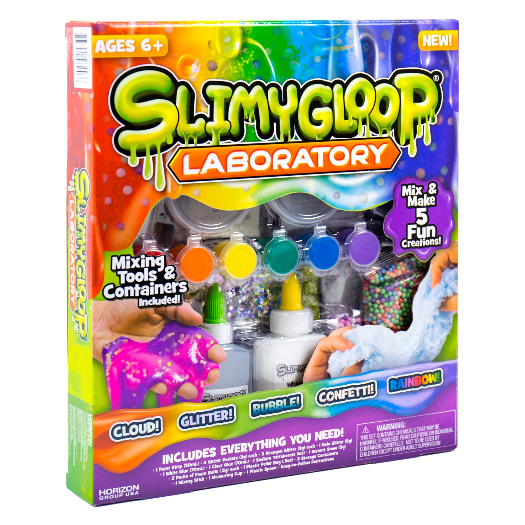Create and design 5 one-of-a-kind creations with the SLIMYGLOOP Laboratory kit! Simply combine the included ingredients using the mixing tools to make multiple slimy creations that feature bright colors, sparkle, bumpy textures and more. This fun and hands-on science kit includes everything you need to make your slime stand out. Recommended for ages 6 and up. Adult supervision required.