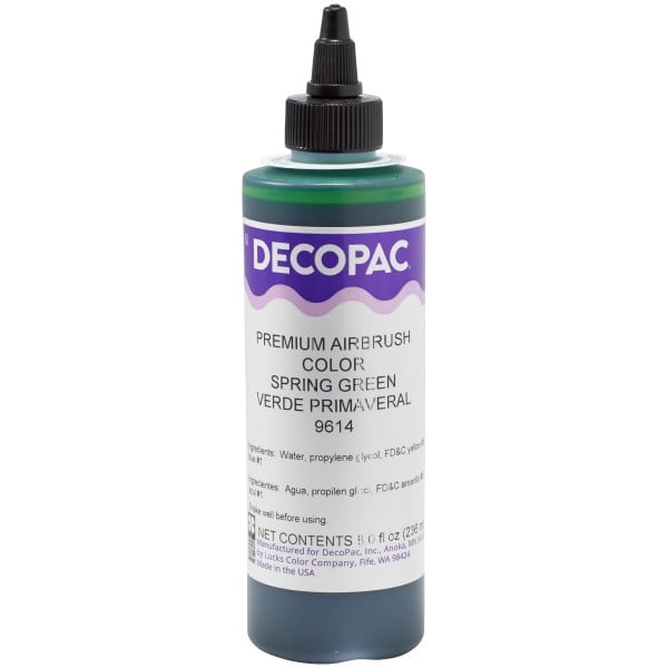 Premium airbrush colors are specially formulated by food color experts for bakeries. Designed to deliver intense shades and color consistency in every bottle. Manufactured in the USA. Shake well before use. 8oz bottle.Decopac Premium Airbrush Color-spring Green