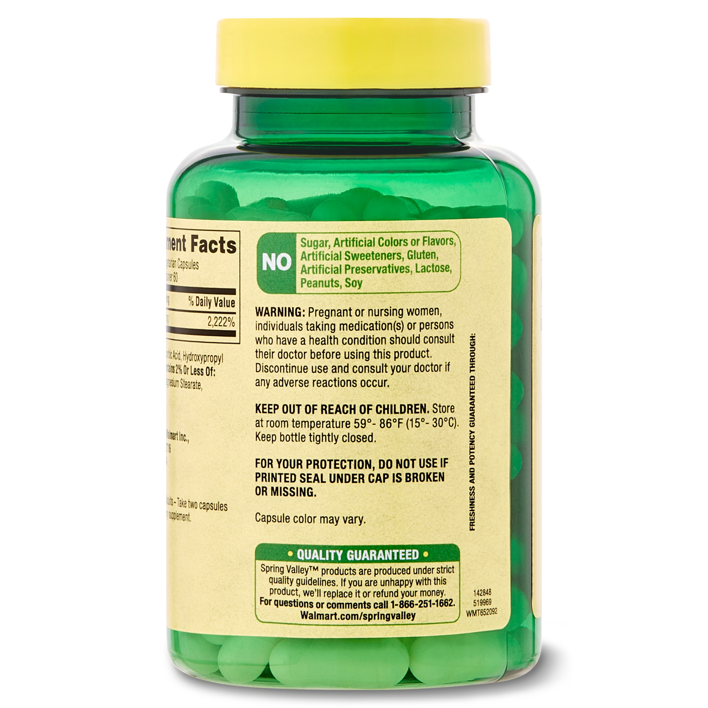 Our Spring Valley Ultra Strength Vitamin C Capsules Dietary Supplement, 2,000 mg is formulated to promote immune health.* Each serving of two capsules delivers 2,000 mg of vitamin C. Vitamin C is a potent antioxidant and an essential nutrient that may support immune, cardiovascular, and bone health.* This formula contains no artificial colors, sweeteners, preservatives, gluten, soy, sugar, or lactose. It is also suitable for vegetarian and vegan diets. You can rest assured that Spring Valley Ultra Strength Vitamin C Capsules Dietary Supplement, 2,000 mg is produced with strict quality guidelines and is backed by our quality guarantee.