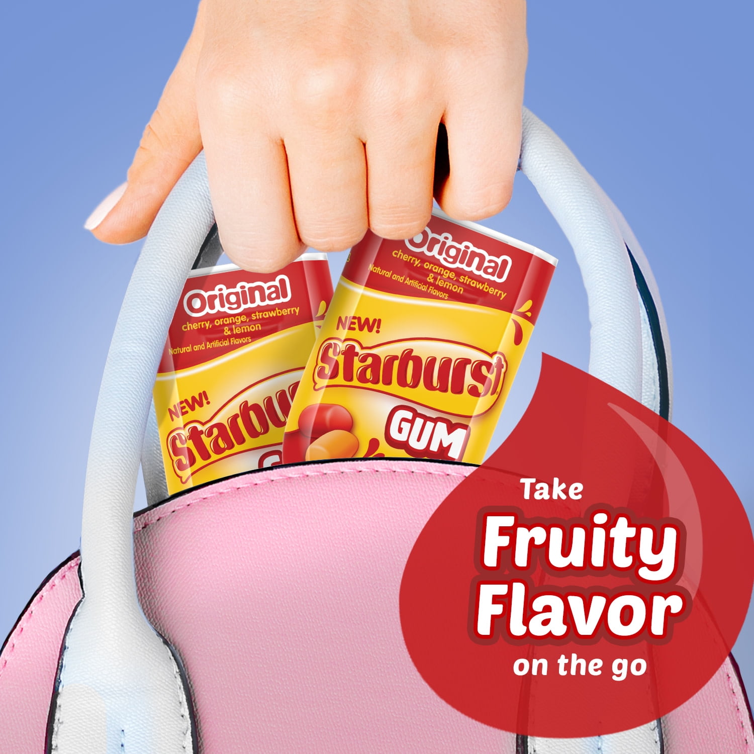 Hopping a train, cramming for a test, running errands. . . STARBURST Original Chewing Gum gives you a burst of fruit flavor wherever you find yourself. The crisp outer shell delivers a delightful crunch. The soft center holds the bold fruit flavor you know and love. This colorful STARBURST gum mix is filled with strawberry, cherry, orange, and lemon flavors. Chew the fruit gum during long meetings, or pop a piece of strawberry gum as a delicious way to pass the time. After you experience the extraordinary juiciness for yourself, spread the love. Share the sugar free gum with your study group, send a bottle in a care package, or surprise your co-workers with a pack of gum in the break room. This bottle is easy to open and close, making it simple to take the juicy goodness of STARBURST Original Chewing Gum on the go.