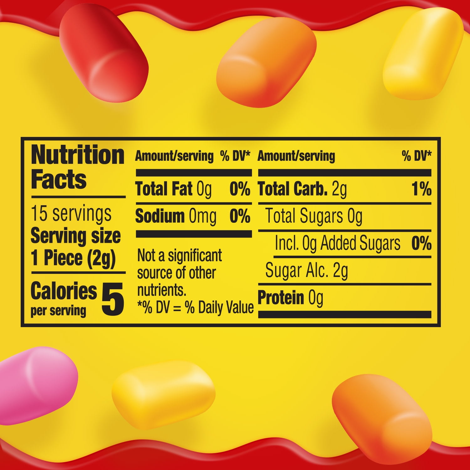 - Natural and artificial flavors. 30% fewer calories than sugared gum. Calorie content of this size piece has been reduced from 7 to 5 calories. Produced with genetic engineering. New! Questions? Comments? 800-974-4539. Dispose of properly.