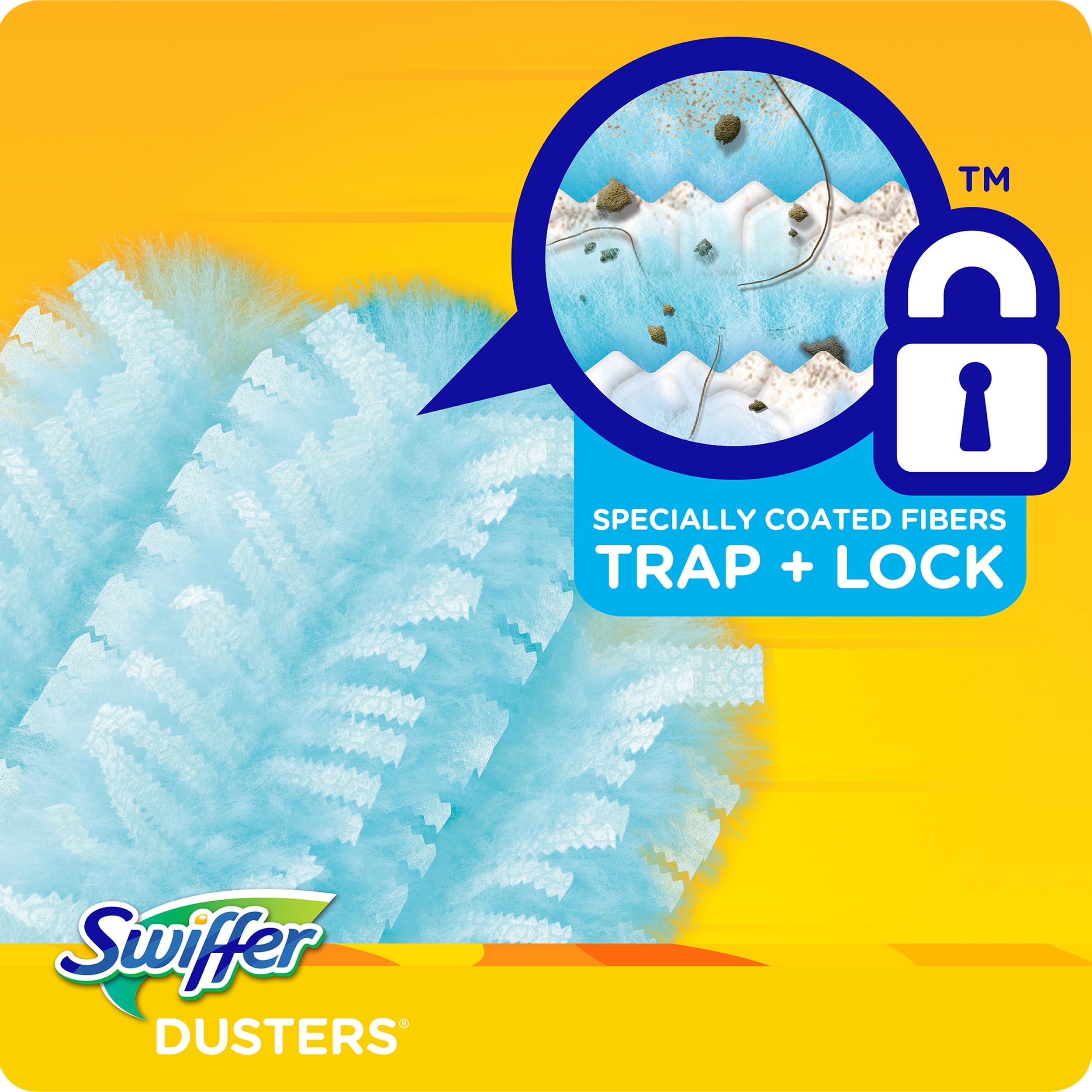 Swiffer 180 Dusters TRAP + LOCK dust & allergens*. Made with specially coated fibers that grab onto dust & don’t let go. They are uniquely designed to Trap + Lock dust from even the tight spaces in your home. *common inanimate allergens from cat and dog dander & dust mite matter