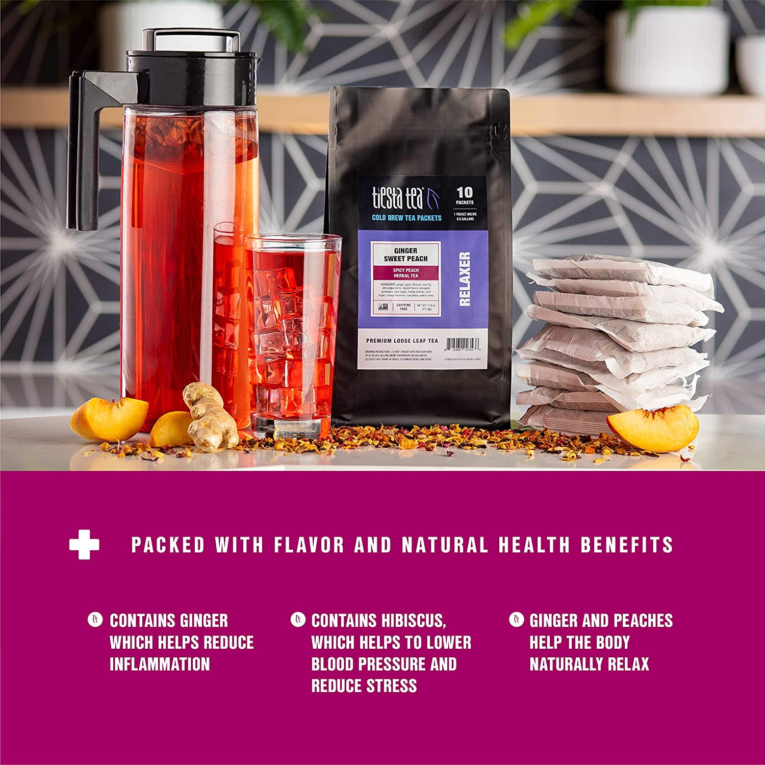 Tiesta Tea Ginger Sweet Peach Cold Brew Tea – Spicy Peach Herbal Tea, Caffeine Free, 10 Cold Brew Tea Bags, Each Bag Brews 1 64oz Pitcher: