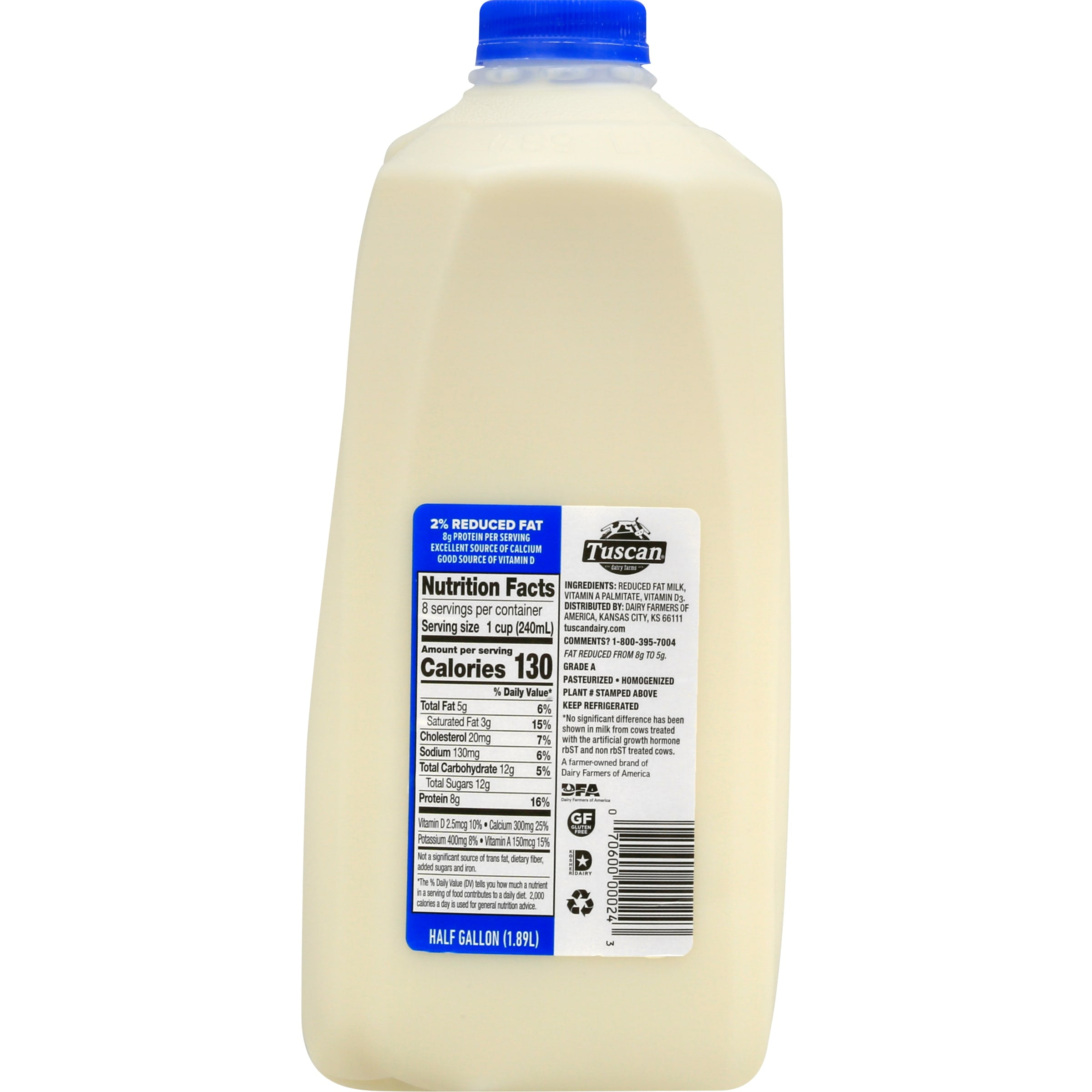 Tuscan Dairy Farms 2% Reduced Fat Milk is reduced fat dairy milk with vitamin A and vitamin D, making it a wholesome choice for the entire family. Creamy and delicious, this 2% reduced fat milk half gallon contains calcium with vitamin D and has 8 grams of protein, 130 calories and 25% of the daily value for calcium per serving. Pour some of this half gallon of milk into a glass for a midnight snack, or enjoy Tuscan Dairy Milk for breakfast by pouring on your cereal. This Tuscan Dairy 2% milk half gallon comes in a convenient milk jug for easy pouring. Farmer Owned. Community Loved. Tuscan Dairy Farms has been providing families with delicious, fresh dairy since 1918.