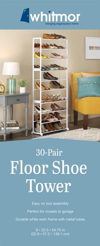 If you’re someone who is obsessed with shoes, then the Whitmor Shoe Tower is an absolute essential for you. It offers an affordable way to organize your shoe collection. This shoe storage rack stands almost 55" tall and can hold up to 30 pairs. Featuring white resin sides with coated metal cross tubes, this Whitmor shoe organizer will continue to provide a reliable storage solution for many years together. You may even snap units together to expand the storage space. Whether you want to keep your heels or flats securely in place. This Whitmor shoe rack assembles in minutes, requiring no tools. Assembled dimensions: 9.0L x 22.5W x 54.75H inches.