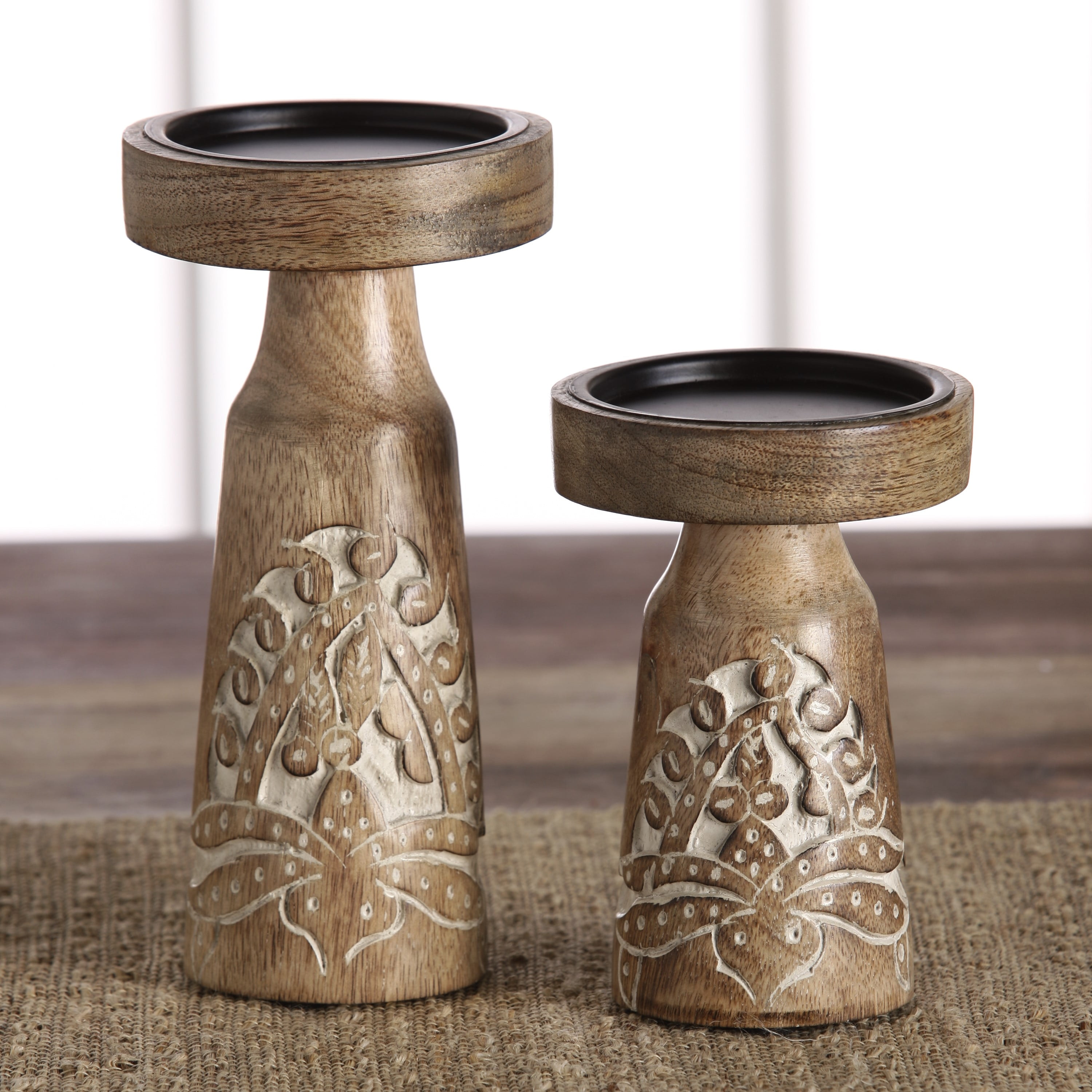 Harvest Carved Look Wooden Candle Platform Holders – 2 Pieces