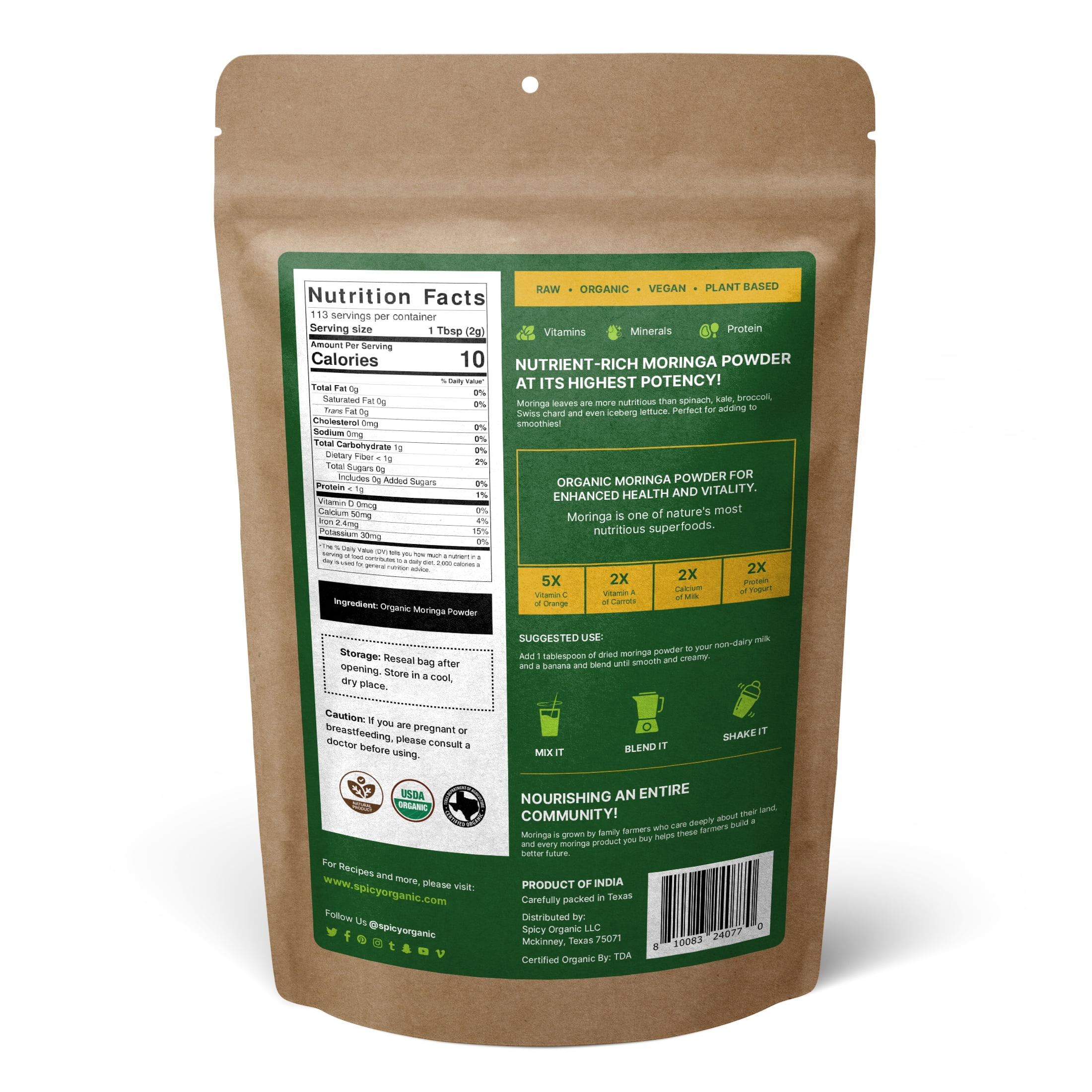 SPICY ORGANIC Moringa Powder (Moringa Oleifera) – 100% USDA Organic- Non- GMO Moringa Leaves Powder. Perfect for Use in Smoothies, Oatmeal, Tea, and a Myriad of Other Culinary Creations – 8 Oz