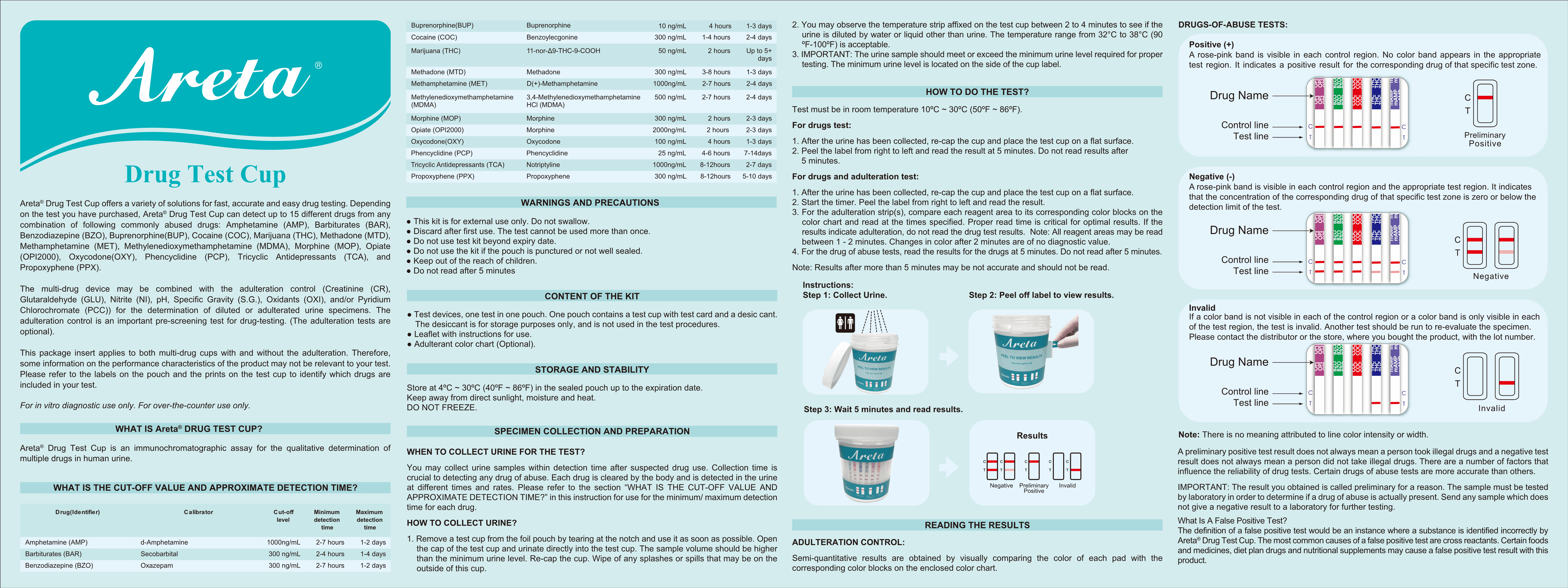 About Areta Test Cup: Over 99% accurate if use correctly Easy to use-just urinate into cup and read results, 2 bold lines appears if clean, 1 bold line appears if not clean; Results in minutes and keep stable up to more than 30 minutes; 2 years shelf life from manufacturing date; 510(K) Cleared and CLIA Waived for OTC use; Ideal for: Home testing/Work place testing /School/college/university testing/Criminal justice/Law enforcement testing/Substance-rehabilitation centers;