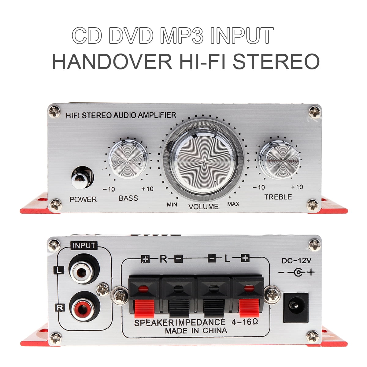The Car Stereo Amplifier-Design: Built with Treble / Bass / Volume control knob, supports treble and bass adjustment. Universa: Wide compatibility, can be connected to most digital electronic products on the market. Material: Made of lightweight aluminum shell, it is portable with overload, short circuit and overheat protection. Service: If there’s any quality issue, please feel free to contact us.