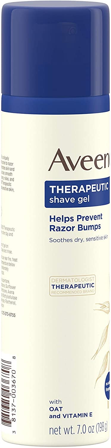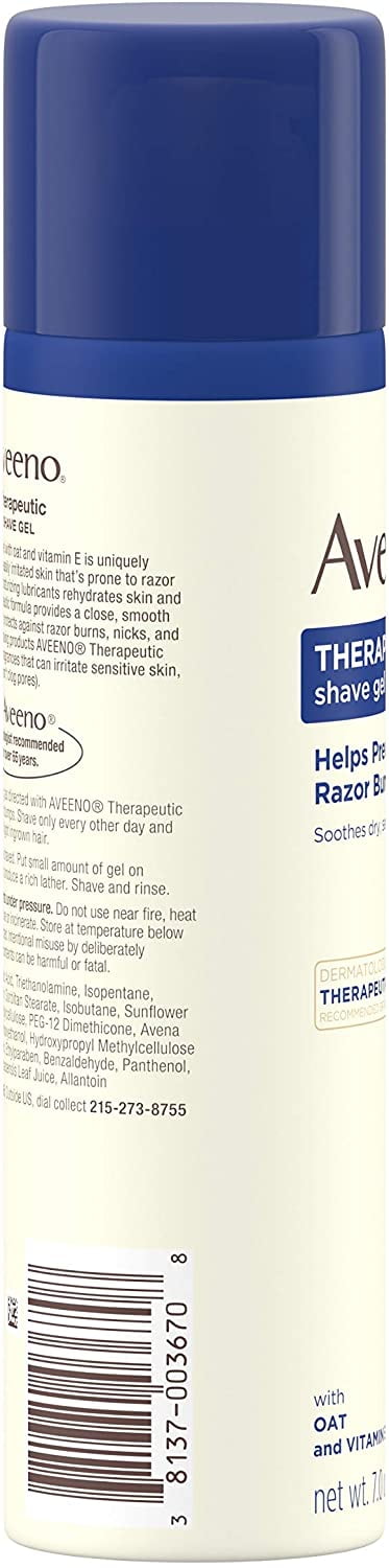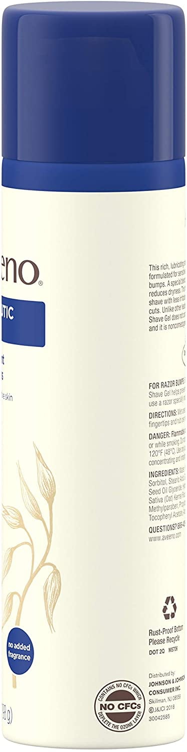 The AVEENO brand has been dermatologist recommended for nearly sixty years. Wet area to be shaved. Put small amount of gel on fingertips and rub over skin to produce a rich lather. Shave and rinse. FOR RAZOR BUMPS: Shaving as directed with AVEENO Therapeutic Shave Gel helps prevent razor bumps. Shave only every other day and use a razor specially made to fight ingrown hair. This therapeutic formula provides a close, smooth shave with less irritation and protects against razor burn, nicks and cuts. Unlike other leading shave product, AVEENO Therapeutic Shave Gel does not contain fragrances that can irritate sensitive skin, and it is noncomedogenic (won’t block pores).Flammable; contents under pressure. Do not puncture or incinerate or store at a temperature above 120 degrees F. Use only as directed. Intentional misuse by deliberately concentrating and inhaling aerosol products can be harmful or fatal. Do not use near flame or spark or while smoking. Keep out of reach of children.