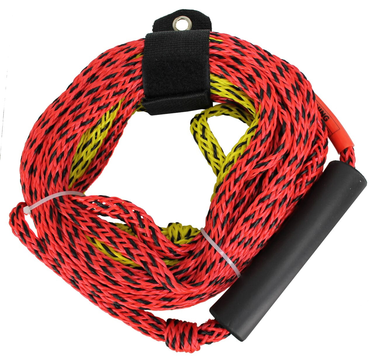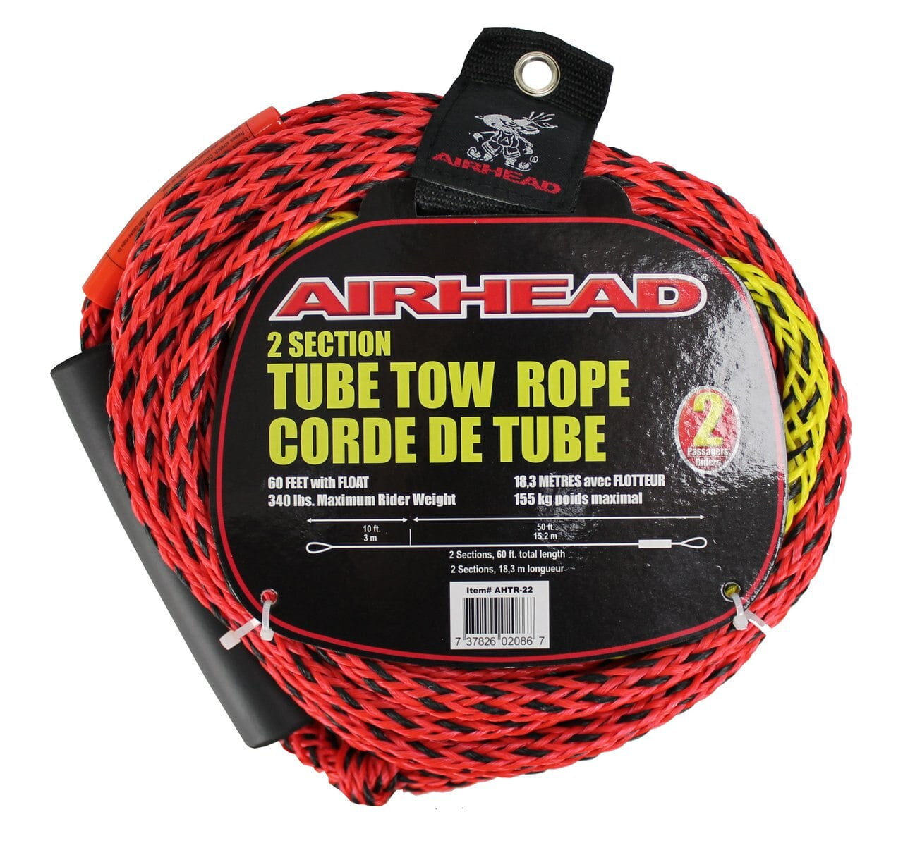 AIRHEAD 2 Rider 2 Section Tube Rope – This tube tow rope has 2 sections, giving you the option to be either 50 or 60 feet behind the boat depending on wake and water conditions. The pre-stretched UV-resistant 7/16 inch diameter 16-strand rope exceeds the 2,375 pound break strength required by the WSIA for 2-rider tubes. A Rope Keeper is included for convenient storage.Product Description AIRHEAD�� 2 Rider 2 Section Tube Rope – This tube tow rope has 2 sections, giving you the option to be either 50 or 60 feet behind the boat depending on wake and water conditions. The pre-stretched UV-resistant 7/16 inch diameter 16-strand rope exceeds the 2,375 pound break strength required by the WSIA for 2-rider tubes. A Rope Keeper is included for convenient storage.