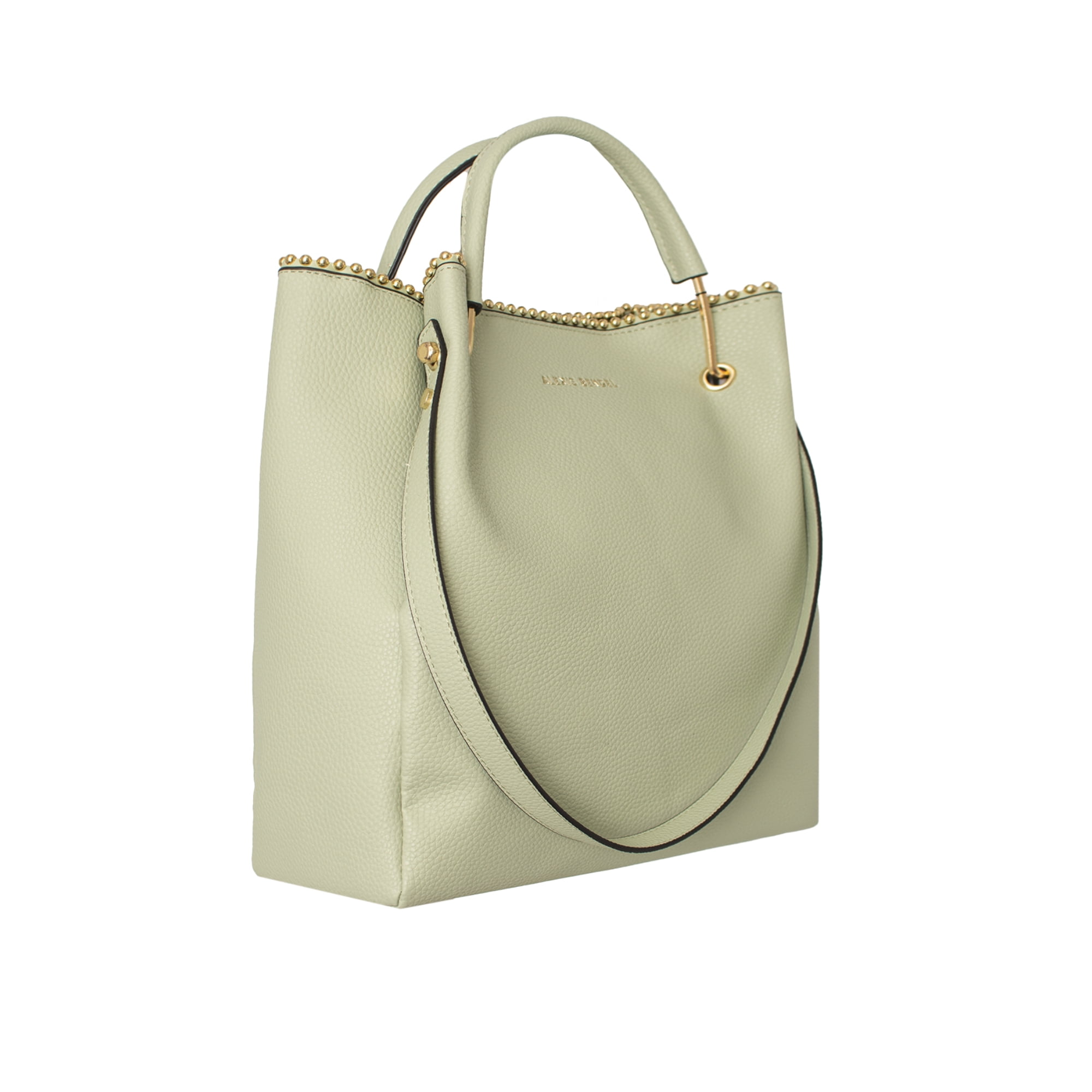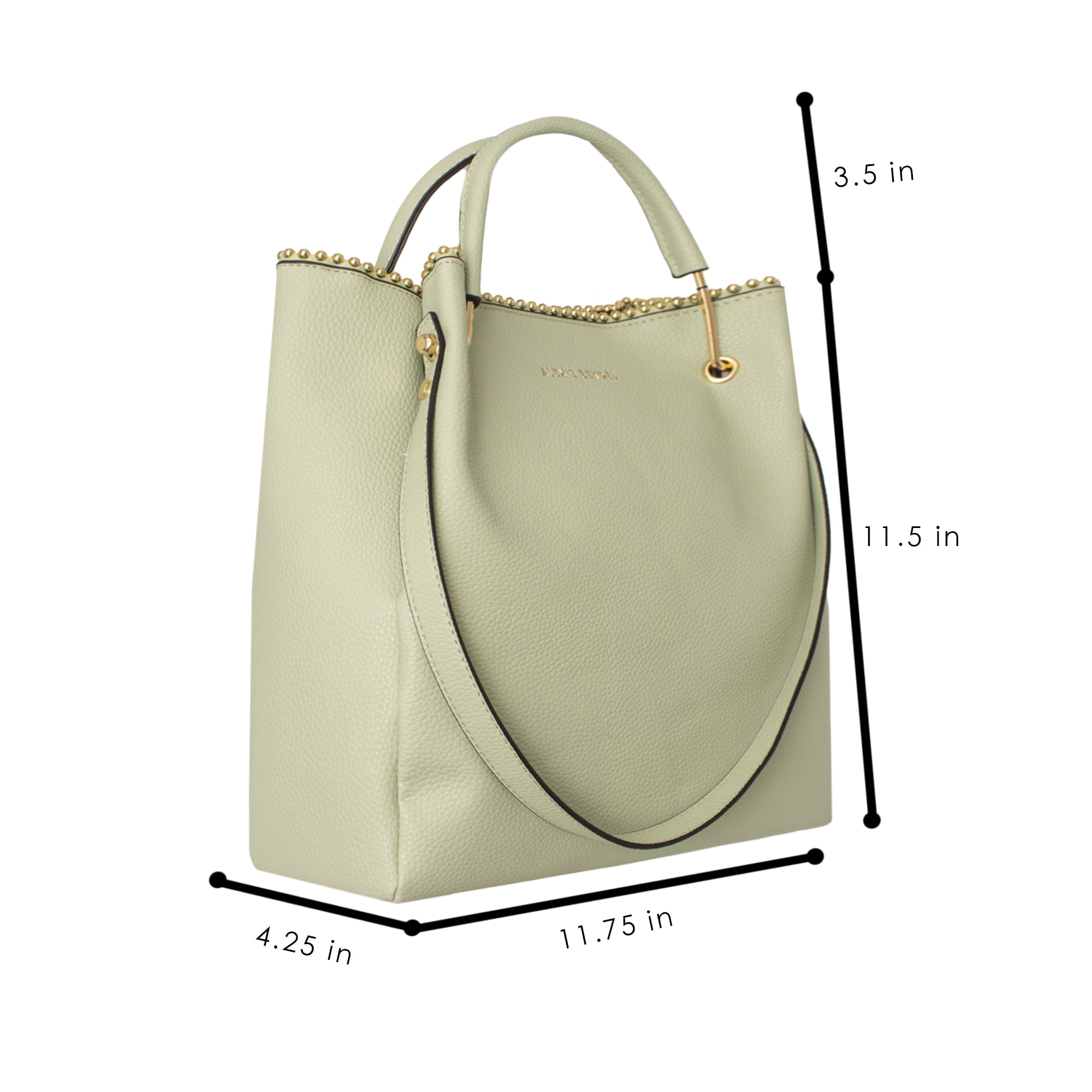Measures: 11.5in L x 12in H x 4.25in D. Designed with vegan leather. Gold hardware finish. Structure: Snap top closure with two interior slip pockets and one zip pocket. Embossed Alexis Bendel logo. Black and white stripe lining. Colors: Black, cognac, cream, mauve and sage. A multi-style accessory to compliment all types of outfits and occasions. Made to fit large items and essentials including your phone, wallet, makeup, keys etc.