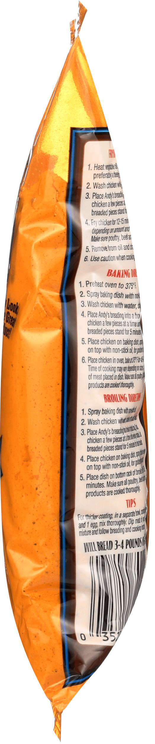 Fried chicken, an American favorite is Andy’s specialty. Andy’s kitchen has created a mild blend of chicken breading for all the "chicken lovers" on this planet. Using the finest wheat and quality ingredients, we combine subtle seasonings that allow the true taste of chicken to come through. Our receipe creates a crispy, well-seasoned coating if baked, broiled, or fried.Bake, broil, or fry. New look, same great product. Traditional corn meal recipe for fish and shrimp. For a listing of our complete product line and recipes, please go to our web page: www.AndysSeasoning.com.