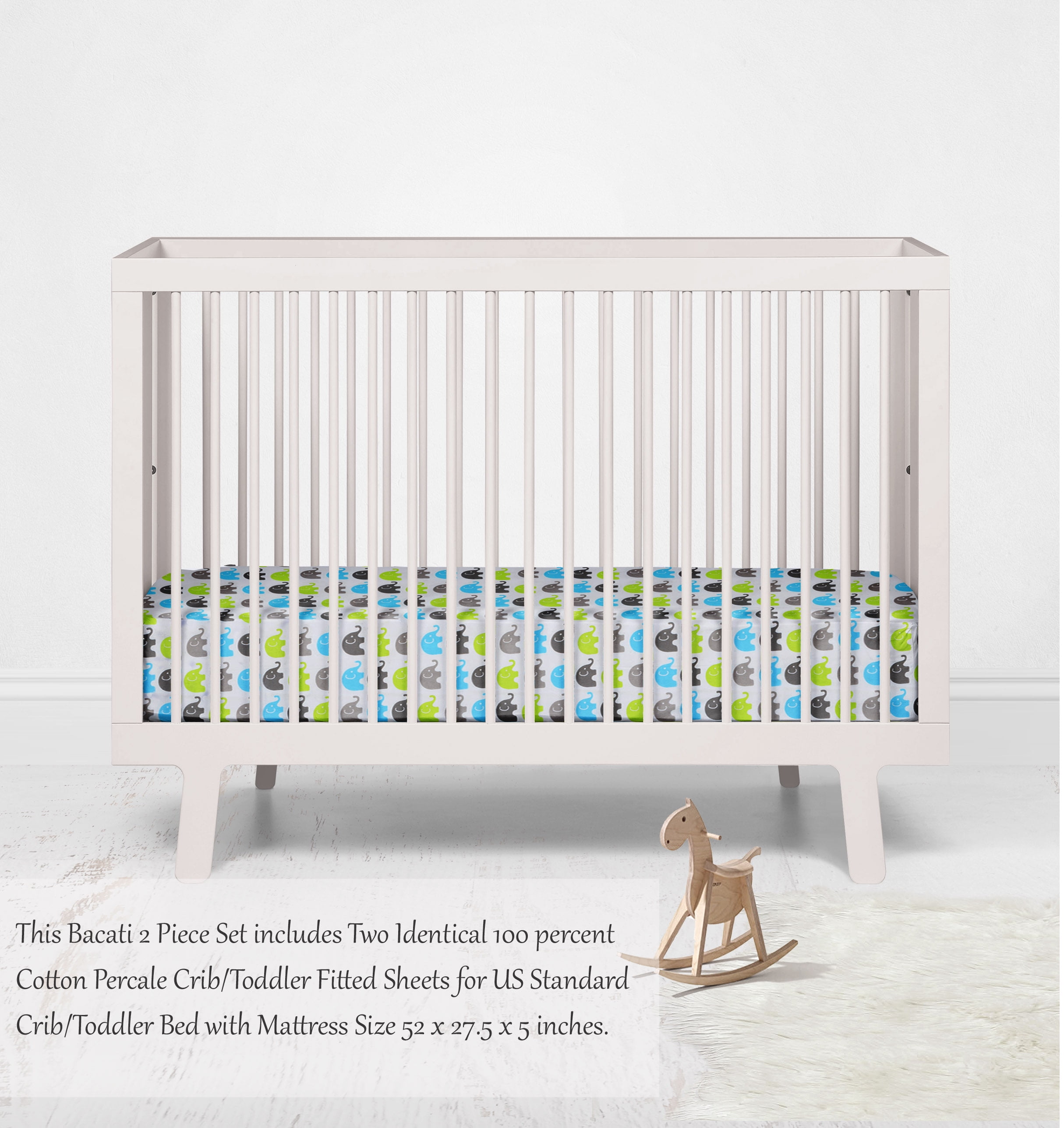 Make sure your baby gets a good night’s rest, and keep your little one snug and comfortable, with this 2-Piece Crib Sheet Set in Aqua/Lime/Grey Mini Elephants from Bacati. This 2-piece set of 52" x 27.5" x 7" crib sheets is form-fitted to keep the sheet snug and smooth on its crib. It’s designed specifically to work with most baby’s mattresses. This premium fitted crib sheet also has an appealing design, with a vibrant Aqua/Lime/Grey Mini Elephants pattern that is sure to add a nice touch to your home nursery, and your little one will find relaxing. The ultra soft 100% cotton super soft fabric is also machine-washable, for an easy no-fuss clean-up after any mess is made, or when it’s laundry day. Give your baby the best night’s sleep possible, and pick up a Crib Sheet Set today!