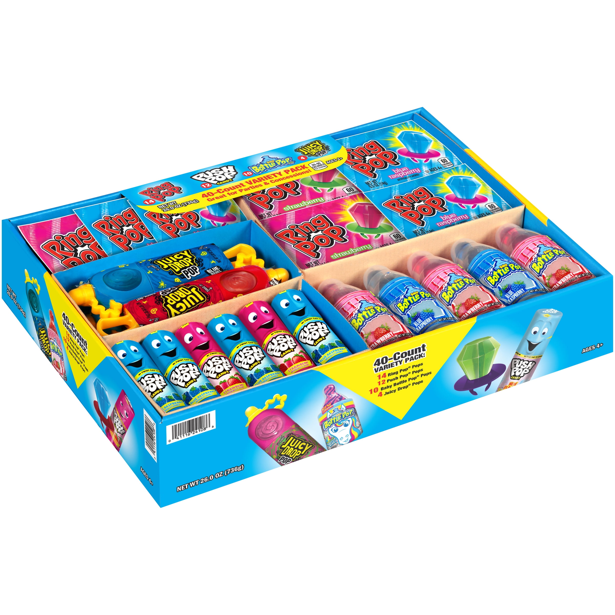 - 40 count box includes 4 Juicy Drop Pop lollipops, 10 Baby Bottle Pop lollipops, 12 Push Pop lollipops and 14 Ring Pop lollipop