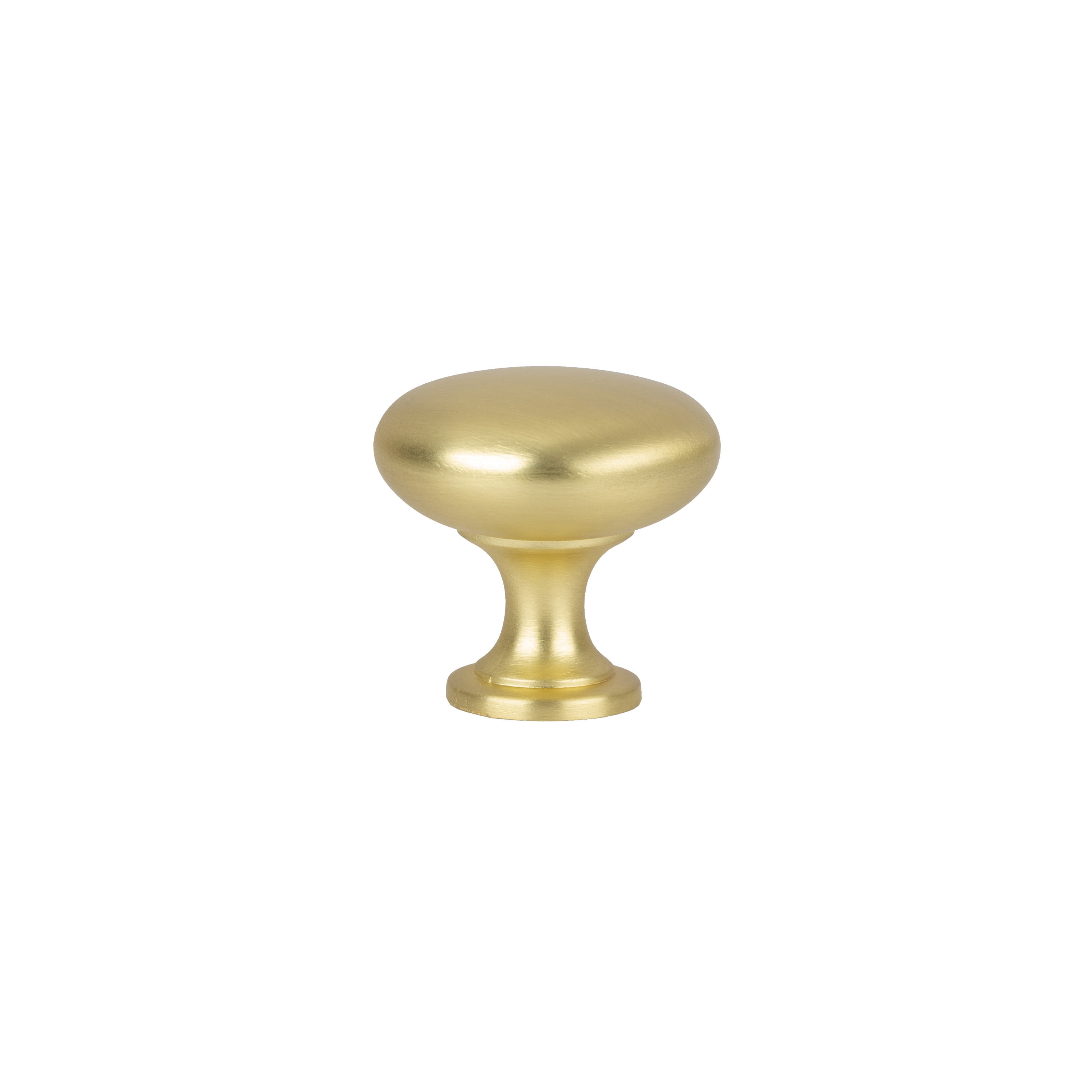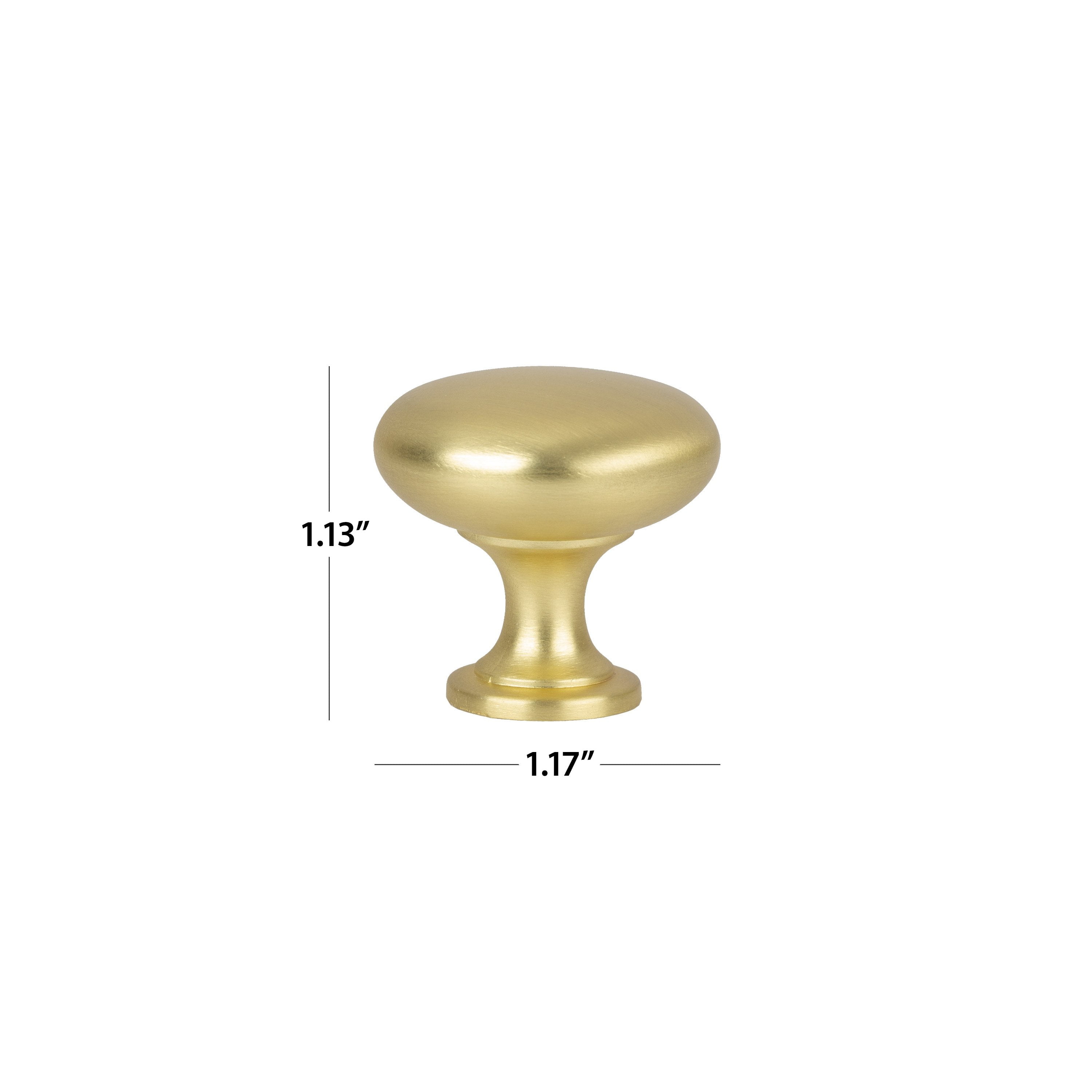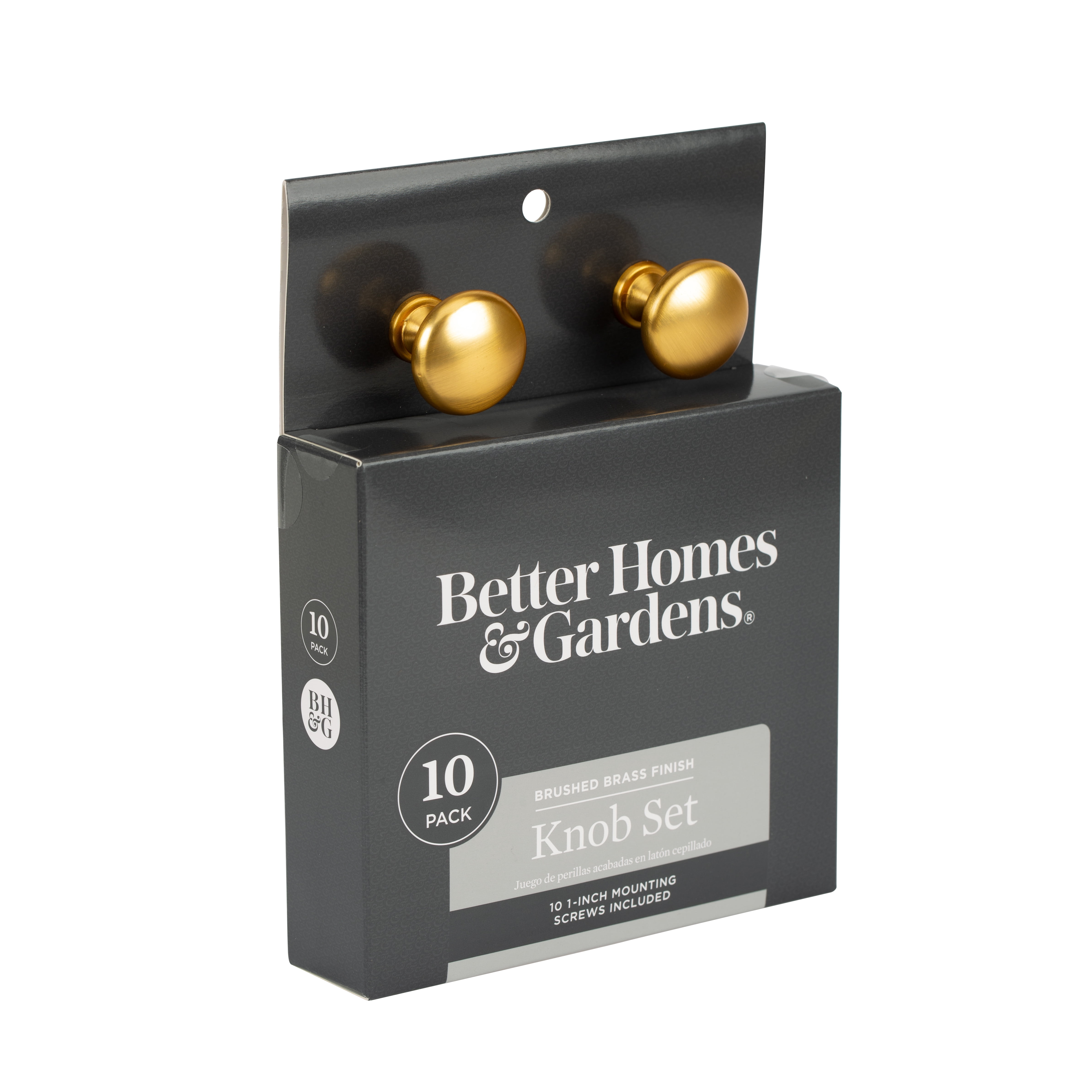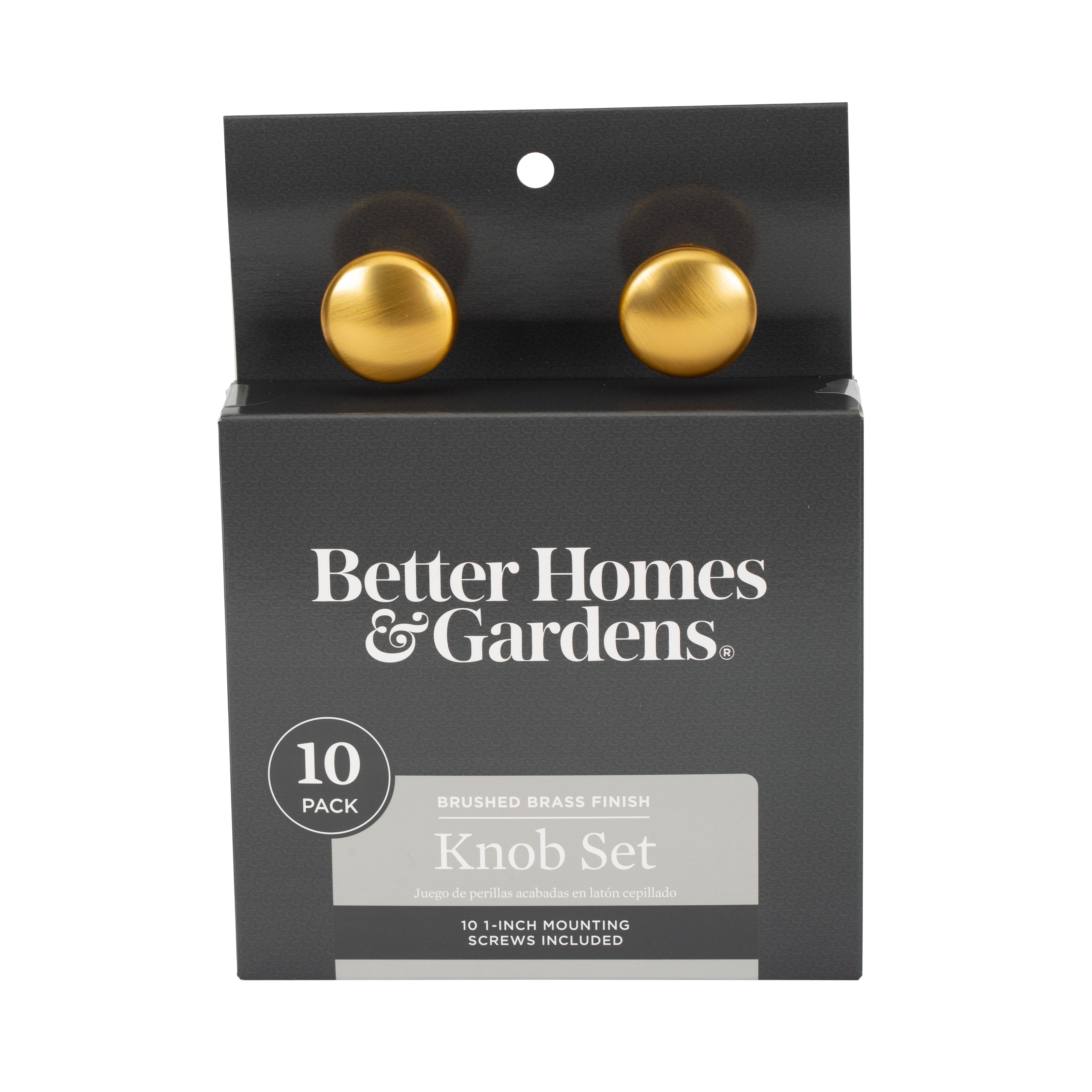 Better Homes & Gardens, knob set adds a touch of elegance to your kitchen or bathroom. This warm brushed brass finish and classic round shape will bring a sophisticated, traditional feel with a modern touch. The timeless design compliments a wide range of decorative styles and the brushed brass finish features a warm gold undertone with smooth matte surface. Easily transform the look and feel of your space or freshen up a piece of furniture by simply updating your cabinet hardware. This knob measures 1 3/16 inches (30 mm) in diameter and has a durable zinc construction. The package includes (10) cabinet knobs and (10) 8-32 x 1 inch mounting screws for a quick, stress free installation. This classic round knob is also available in a 2 count pack and also offered in a satin nickel finish. Product dimensions are 1.17 in. L x 1.17 in. W x 1.13 in. H.