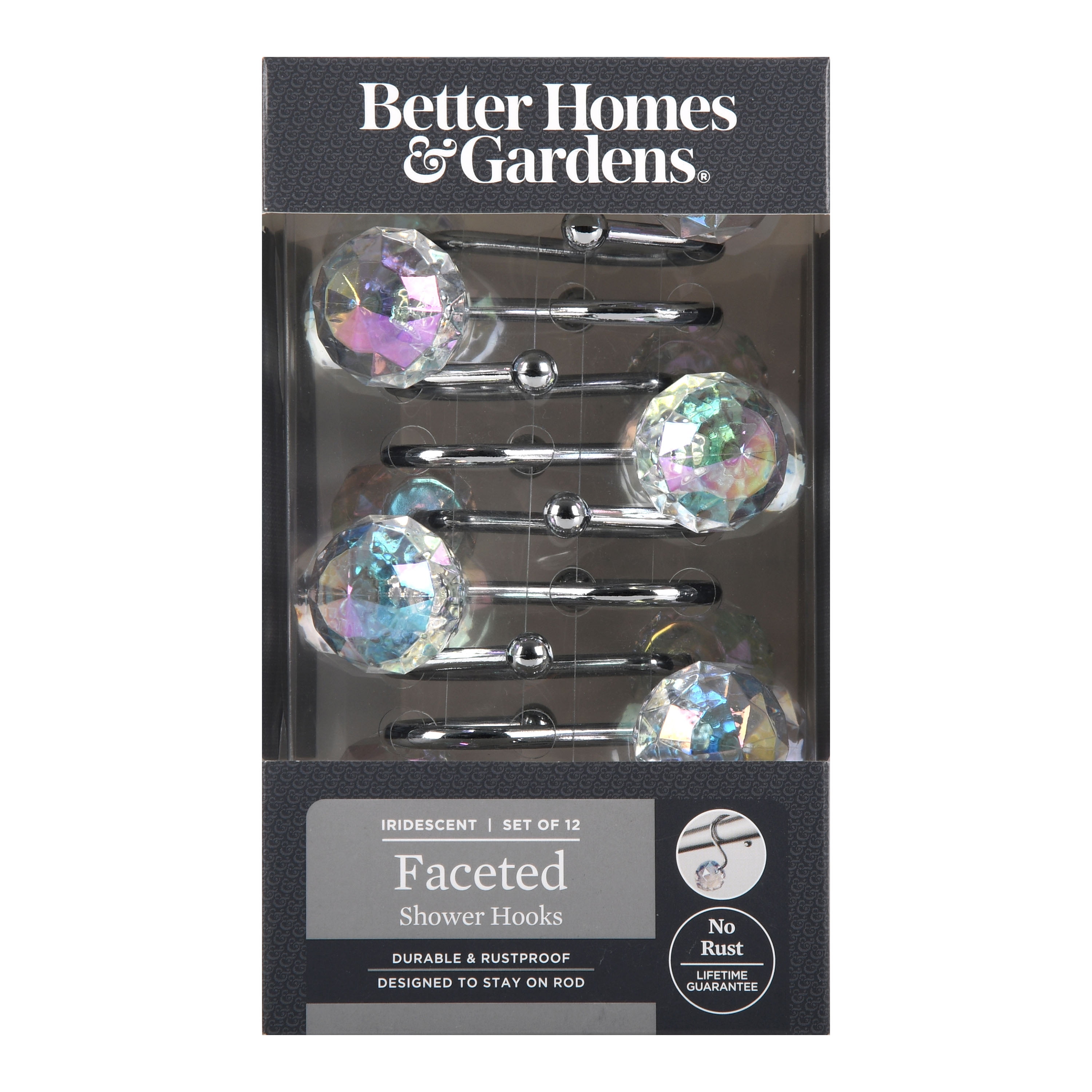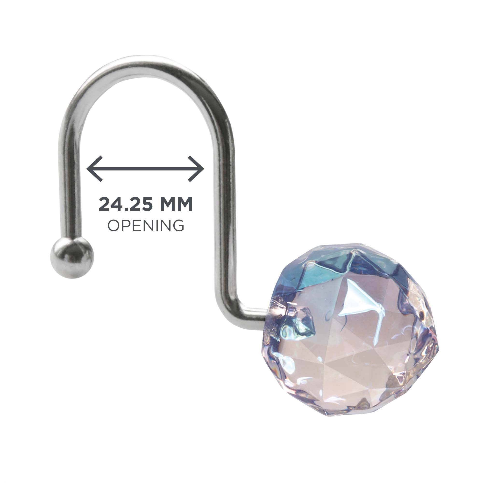 Give your bathroom décor a glamorous update with Better Homes & Gardens Rustproof Aluminum Decorative Faceted Iridescent Ball Shower Curtain Hooks. Featuring a faceted design and an iridescent sheen, these durable, rustproof hooks will accentuate any shower curtain or liner. The decorative shower hooks have a 24.25 mm opening (0.95 in.) and are designed to fit and stay on on any standard shower rod. The aluminum shower hooks can be coordinated with bathroom accessories of assorted finishes. For easy care, just wipe the shower curtain rings clean with a damp cloth. Each package includes 12 hooks to match the number of holes on standard curtains and liners.