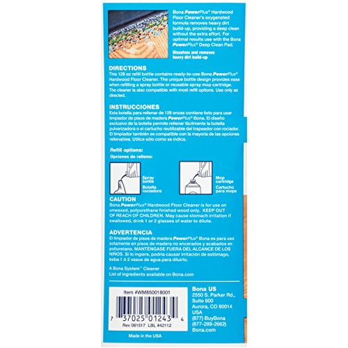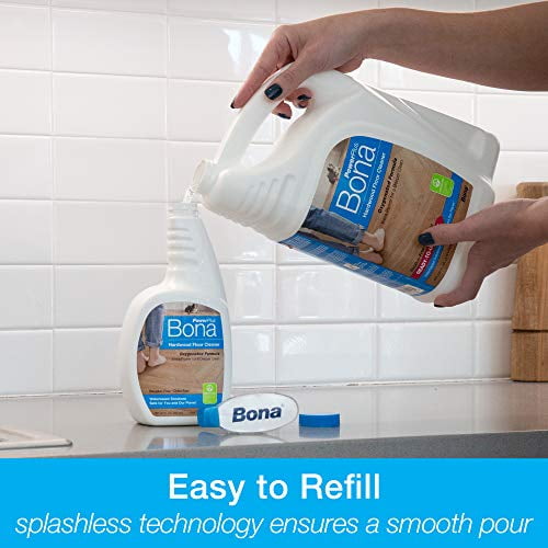 Readytouse economy size refillSplashless technology insures a smoother pourOxygenated formula penetrates for a deep, powerful cleanWaterbased cleaning formula dries fast, is residuefree, and safe for people, pets and the planetSafe for all unwaxed, unoiled, polyurethane finished wood floorsGREENGUARD GOLD certified – very low VOC emissionsFor optimal results, use with the Bona PowerPlus Microfiber Deep Clean Pad.Bona Hardwood Floor Cleaner Refill, 128 oz