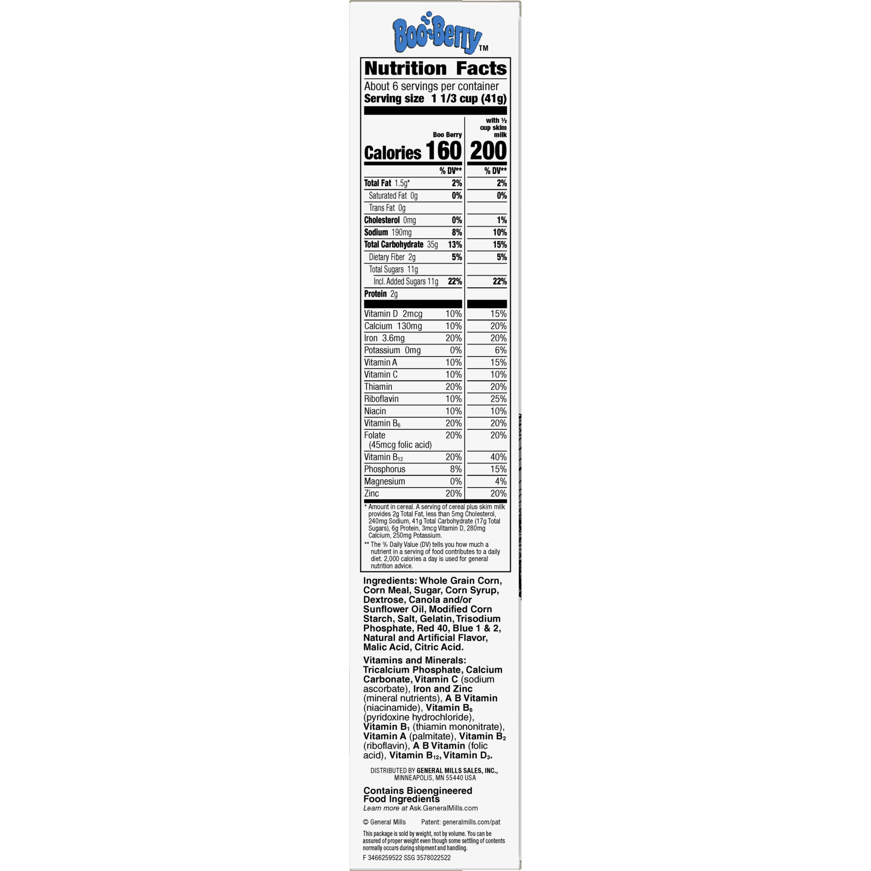 Limited Edition Boo Berry Cereal. Berry Flavor Frosted Cereal with Monster Marshmallows has 14g of Whole Grain per Serving.