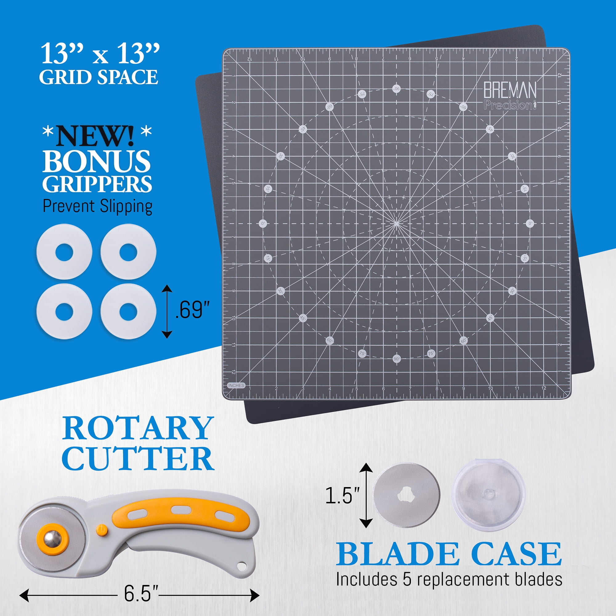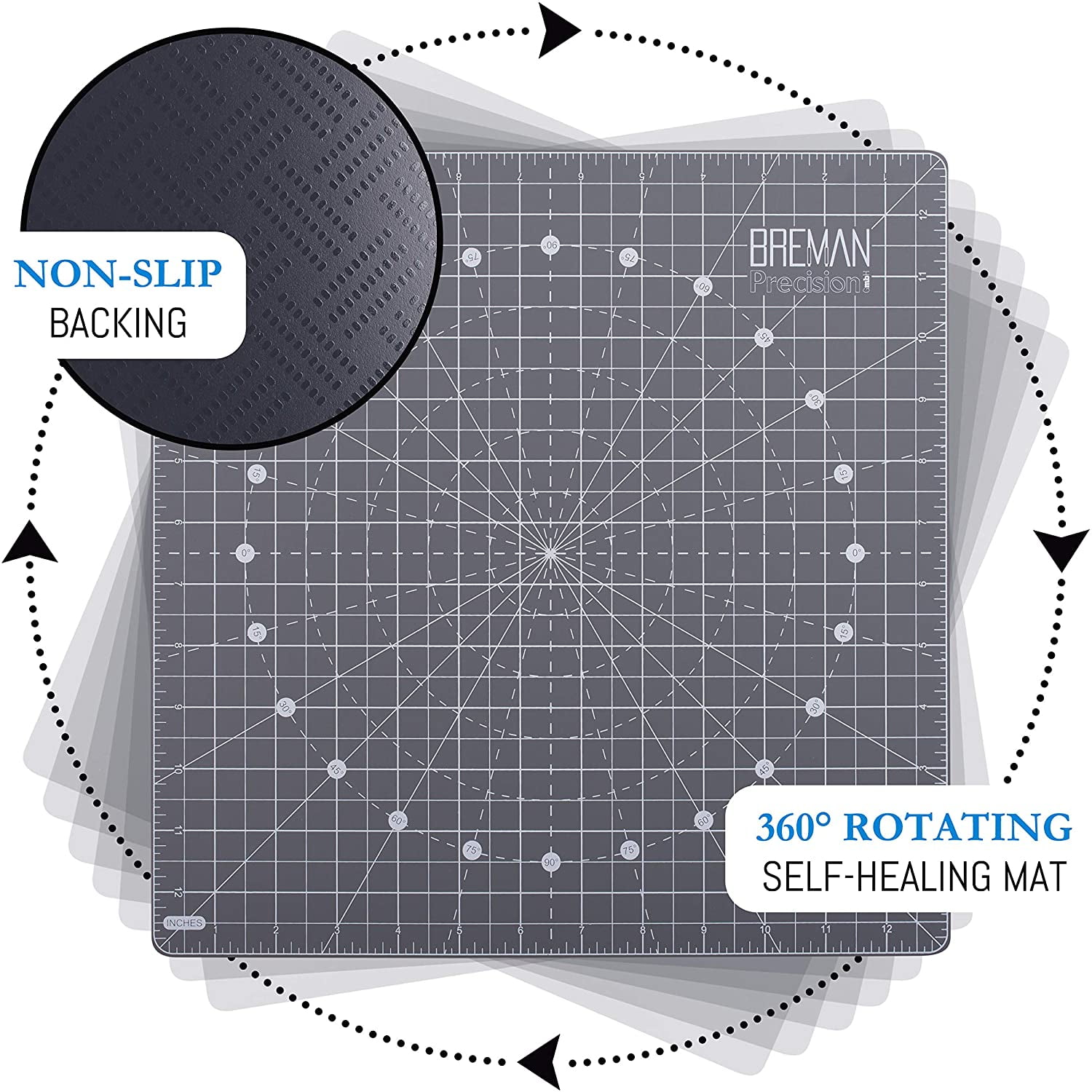 Accomplish your goals faster and more effectively with Breman Precision’s rotating cutting mat set! The cutting mat has a durable, self-healing surface and a non-skid bottom to prevent the mat from sliding. We’ve also included 4 anti-slip silicone grippers to add to the base of your cutting mat for added stability. Our cutting mats have clear markings on every side so you can cut at any angle with the included rotary cutter and 5 sharp 45mm replacement blades.