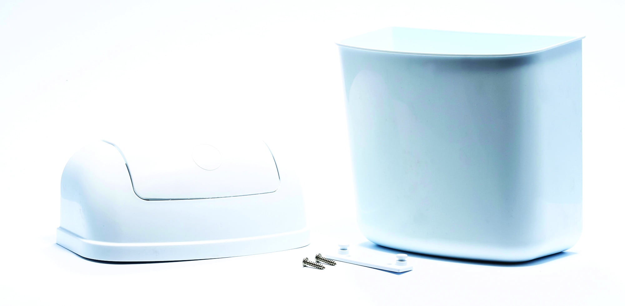 Keep your RV neat and tidy with this Camco Wall-Mount white Trash Can and it features a compact design with a spring lid which is ideal for tight spaces. The RV trash can is convenient to install. It can be mounted on a wall or inside a cabinet and features a swing-top lid for easy access.