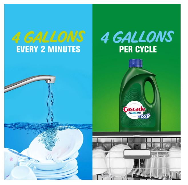Cascade Complete Gel + Oxi, Dishwasher Detergent, 125 fl oz Highlights Powers away 24-hour stuck on food Stain-fighting gel, removing tough food and beverage stains like tea More tough food-cleaning ingredients (vs. Cascade Original Gel) Easy-to-pour spout Safe to use on all dishwasher-safe dishesCascade Complete Gel + Oxi, Dishwasher Detergent, 125 fl oz